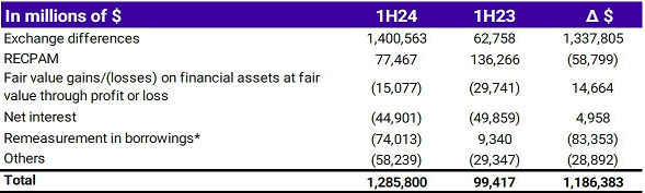 汇率差异带来的汇兑收益,以实际价值衡量,是通胀超过美元兑阿根廷比索升值幅度的结果(1H24分别为79.8%和12.8%)。