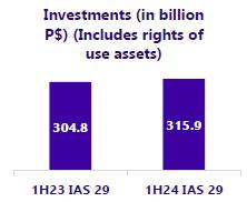 1H24期间,公司投资(含使用权资产)P $ 3159.46亿(+ 3.7% vs. 1H23)。上述投资占1H24合并收入的19.0%。截至2024年6月30日,不考虑资产使用权的投资总额为2245.92亿P美元(-1.8 % vs. 1H23)。