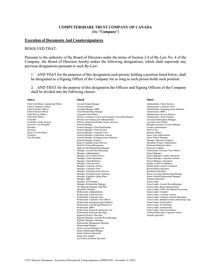 CTCC董事决议–执行文件及会签(获批准– 2023年11月15日)加拿大计算机股份信托公司(“公司”)执行文件及会签决议:根据董事会根据公司第4号附例第2.4节条款的授权,董事会特此作出以下指定,该等指定应取代先前根据该等附例作出的任何指定:1。及就本指定而言,担任以下所列职位的每名人士,只要担任该职位,均须获指定为公司的签署人员。2.并表示就此指定而言,公司的高级职员和签署人员应分为以下几个级别:A类B类C类首席反洗钱官首席合规官首席执行官首席财务官首席隐私官首席风险官控制器、北美执行副总裁总裁总裁秘书高级副总裁司库副总裁客户组经理客户经理助理经理、MBS客户关系经理企业信任官董事、企业行动和乔治森资产统一董事、治理和行政总监、注册产品受托人服务总经理,客户关系总经理、客户服务总经理、企业信托总经理、Corporation Actions总经理、Emerging Issuer Solutions总经理、Registry Head of Canadian Issuer Services供应商管理主管High Growth Relationship Manager、Account Recording Manager、Administration Manager、CCS客户服务经理、客户运营经理、客户关系经理、客户服务经理、企业行动经理、企业信托经理、新兴发行人服务经理、新兴发行人解决方案经理、员工权益计划经理、MBS经理、石油特许权使用费经理、关系经理NA区域经理、NBI/PSG运营经理专业、行政管理专业、客户服务专业、企业信托专业、企业信托专业、新兴发行人解决方案专业、租赁和矿物税专业、MBS专业、研究和所得税专业、研究和法律区域总监、计划运营区域经理、账户记录保存区域经理、会议关系管理经理关系经理高级客户经理CCS高级关系经理高级解决方案专家高级测试分析师税务与和解专家管理员、客户服务管理员、企业信托管理员、新兴发行人解决方案管理员、MBS管理员、服务交付管理员、股票转让协理关系经理协理信托官双语助理客户经理柜台管理员税务内部审计师负责人发行人凯奇管理员初级项目经理经理,运营支持运营项目管理员Printroom Dispatch Admin Processor Complex Professional,Associate Trust Officer项目经理Project Manager Canada,Operations Project Manager,Corporate Actions Project Manager,Operations Quality Control Coordinator Quality Improvement Coordinator Reconciliation Specialist Resolution Specialist Senior Associate Relationship Manager Senior Growth Relationship Manager Solutions Specialist Team Leader Team Leader,Account Recording Team Leader,Bond Administration Team Leader,CDSX and Manual Processing Team Leader,Complex Team Le企业行动转移专家 |