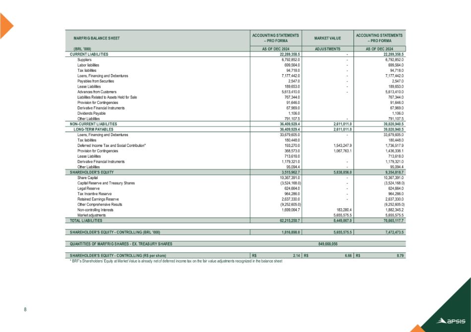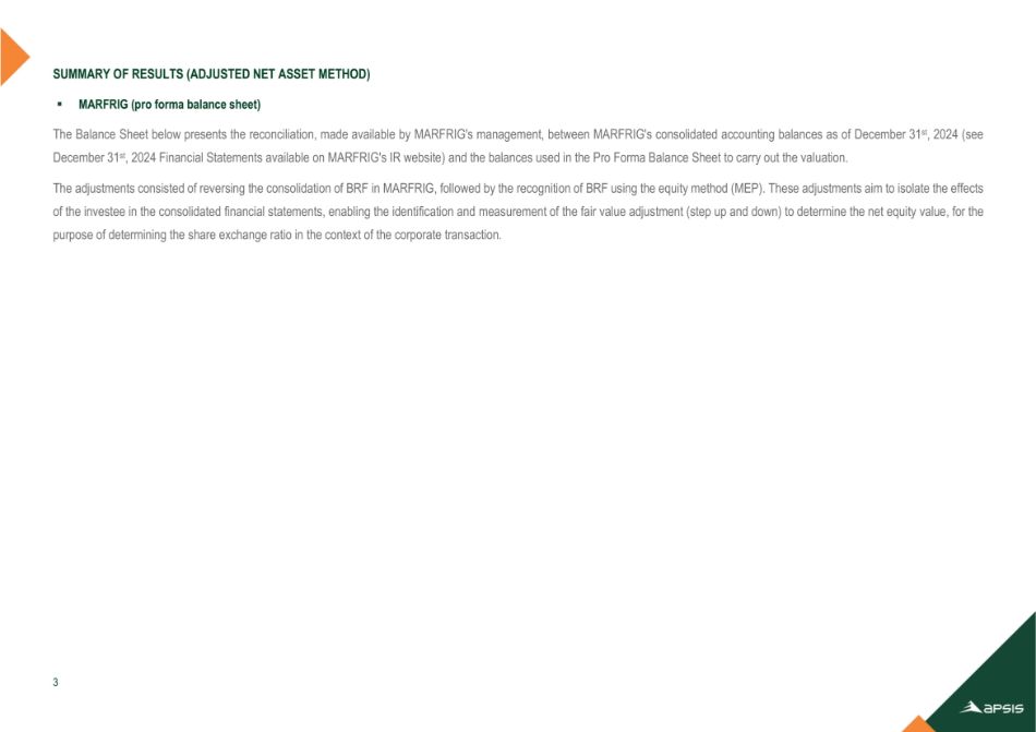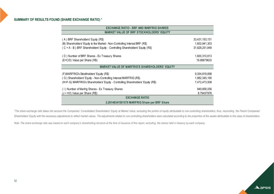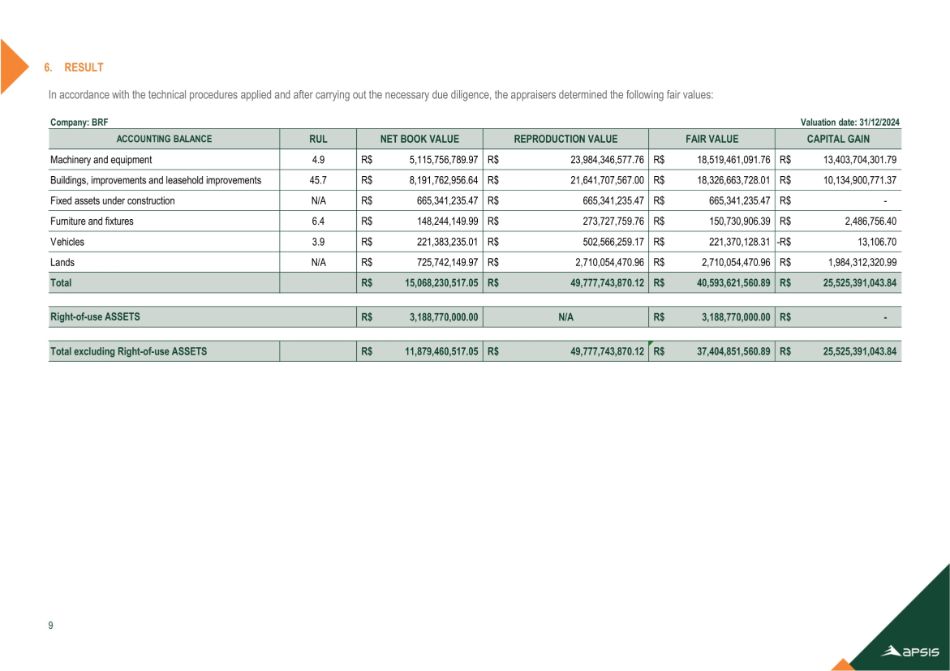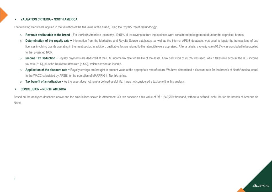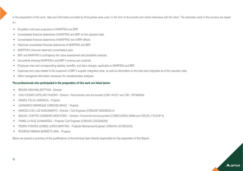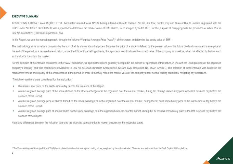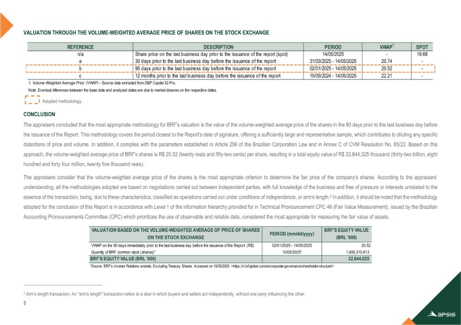 | (三) | 批准任命总部位于里约热内卢州里约热内卢市Rua do Passeio,No. 62,6th floor,Centro,CEP 20021-290,总部位于里约热内卢州里约热内卢市Rua do Passeio,No. 62,6th floor,CEP 20021-290的CNPJ/MF注册号为08.681.365/0001-30和CRC/RJ注册号为05112/O-9的专业化公司Apsis Consultoria Empresarial Ltda.(“评估公司”)负责编制(a)将由MGF注册成立的BRF发行的股份的评估报告,按市场价值,在合并范围内(“合并评估报告”);以及(b)载有计算BRF非控股股东所持股份交换比例的评估报告,基于MGF和BRF股份的权益净值,根据巴西公司法第264条,以相同标准并于2024年12月31日以市场价格对这两项资产进行评估(“264评估报告”); |