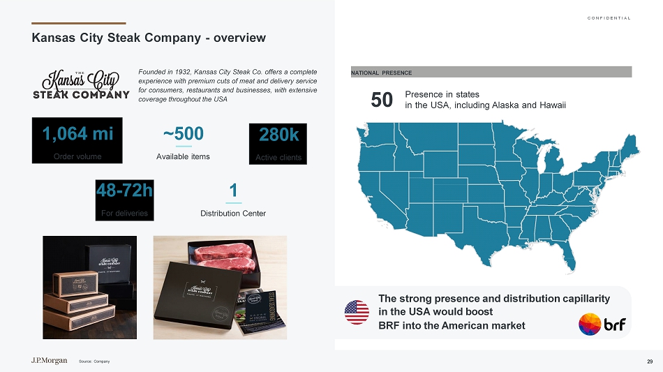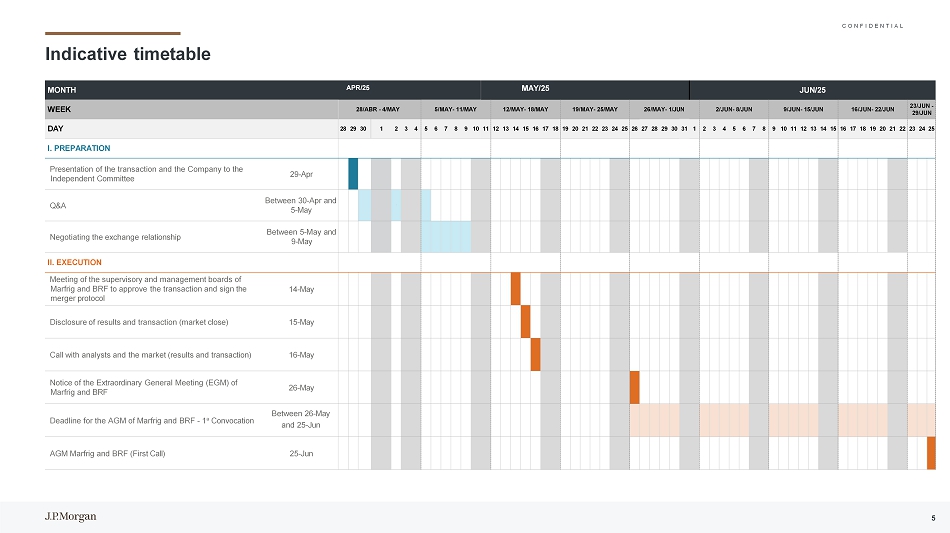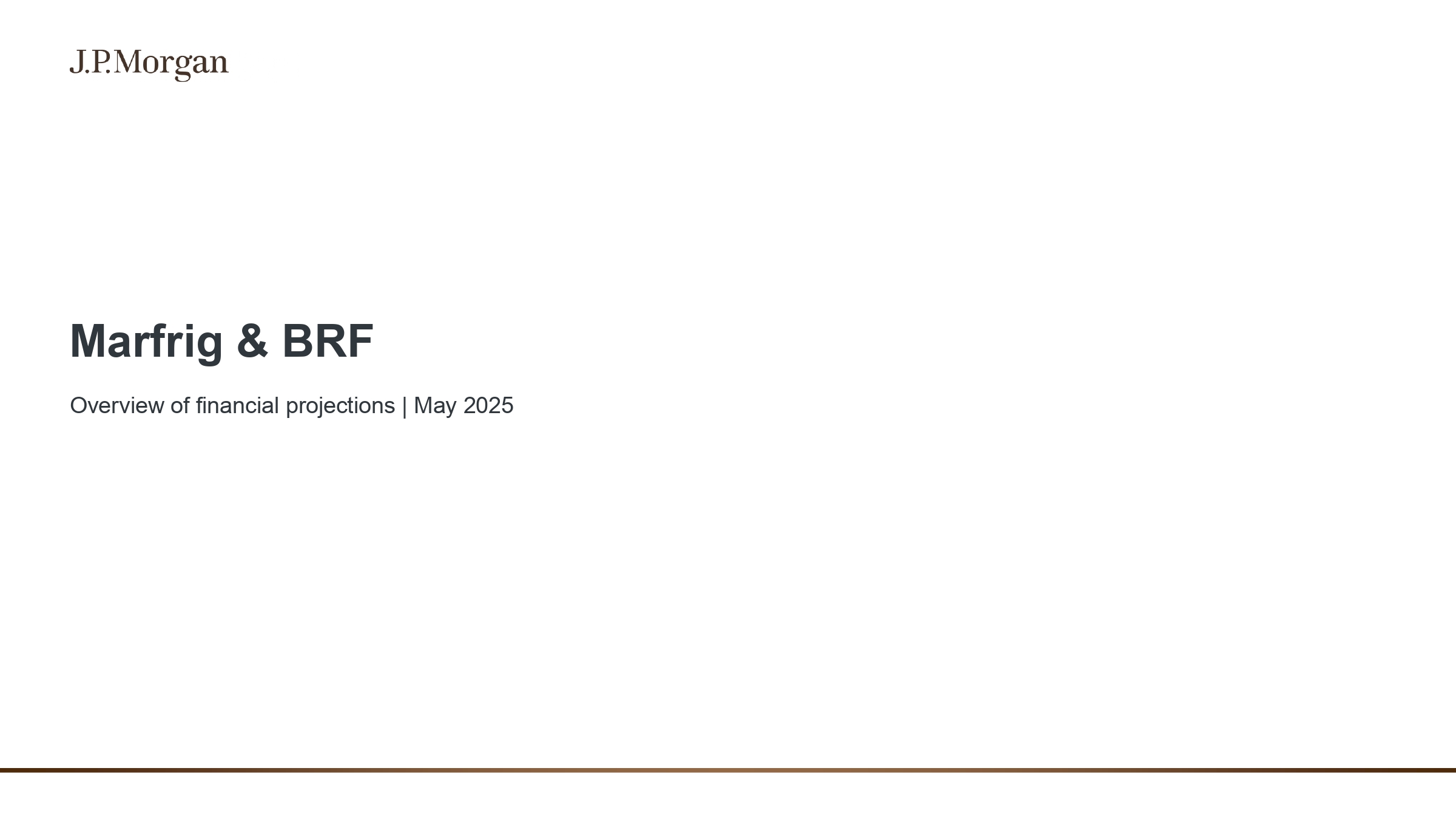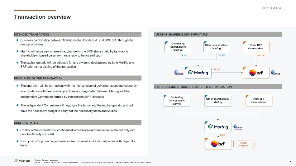 C O N F I D E N T I A L资料来源:公司46免责声明高度机密本演示文稿仅为Marfrig Global Foods S.A.的利益和内部使用而编制,Marfrig Global Foods S.A.是其直接指向和交付的客户(包括该客户的子公司,“公司”),以协助公司对一项或多项可能交易的可行性进行初步评估,确定该可能交易的适当结构,并就其财务方面进行谈判。这份材料只能结合摩根大通提供的口头简报来分析和理解。本演示文稿不得全部或部分复制、重新分发或传播。未经摩根大通事先书面同意,不得披露本演示文稿及其任何内容或将其用于任何其他目的。此外,此演示文稿可能包含最初由AI或其他自动化技术生成的内容。所提供的信息基于已提供给摩根大通的预测,反映了当前状况和我们截至该日期的意见,如有更改,恕不另行通知。摩根大通不对可能收到的与交易相关的实际金额以及达成交易的法律、税务或会计影响作出任何陈述。本演示文稿仅包含经济和财务分析,不涉及任何法律、监管或税务方面。本材料的编制并不是为了用作公允意见、估值报告或任何其他类似目的,因此,不应被视为公允意见、估值报告或任何其他类似目的。此外,根据经修订的1976年12月15日第6.404号法律(“巴西公司法”)第8条和/或巴西公司法第4、8、227、228、256或264条和/或巴西证券交易委员会(CVM)发布的任何决议、意见或条例,特别是第78号决议规定的决议、意见或条例,本演示文稿并未编制,也不应用于遵守巴西的任何法律、规则或条例的目的,包括但不限于为出资或资本形成的目的,85或160(包括其各自的附件)和/或为任何证券交易所发布的任何决议、意见或法规的目的,特别是B3 S/A-Brasil,Bolsa e Balc ã o。除非在此明确设想,本演示文稿中包含的信息未考虑到可能的交易或涉及实际或潜在控制权变更的交易的影响,这些交易可能具有重大的估值和其他影响。摩根大通对本演示文稿所载信息的准确性、完整性或可靠性不作任何明示或暗示的陈述或保证。第三方(公司除外)对本演示文稿所载信息的任何依赖均由该第三方承担风险。摩根大通不对因使用本演示文稿中包含的信息或其中包含的任何错误或遗漏而引起的任何损失或损害承担责任。在编制本演示文稿时,我们依赖并假定,在未经独立核实的情况下,从公开来源获得或由公司或代表公司提供给我们的所有信息的准确性、正确性、完整性和完整性。尽管有任何相反的情况,公司及其每一名雇员、代表或其他代理人可向任何和所有人(不限于任何种类)披露在此设想的交易的联邦和州所得税待遇以及联邦和州所得税结构,以及向公司提供的与此种税收待遇和税收结构有关的所有种类的材料(包括意见或其他税收分析),只要此种待遇和/或结构与银行向公司提供的联邦或州所得税策略有关。摩根大通的数据隐私政策可查阅http://www.jpmorgan.com/pages/privacy。摩根大通是与美国证券交易委员会(Securities and Exchange Commission)达成的一项涉及研究的和解协议的一方,因此,摩根大通通常不被允许在投资银行业务的提案中使用其研究部门的资源。这份报告中包含的所有观点都是摩根大通投行的观点,而不是研究部门的观点。摩根大通的政策禁止员工直接或间接提供有利的评级或特定价格目标,或提议改变相关公司的评级或价格目标,以换取或作为获得业务或付款的诱因。摩根大通还禁止其研究分析师因参与投行业务而获得报酬, 除非此类参与旨在使投资者受益。