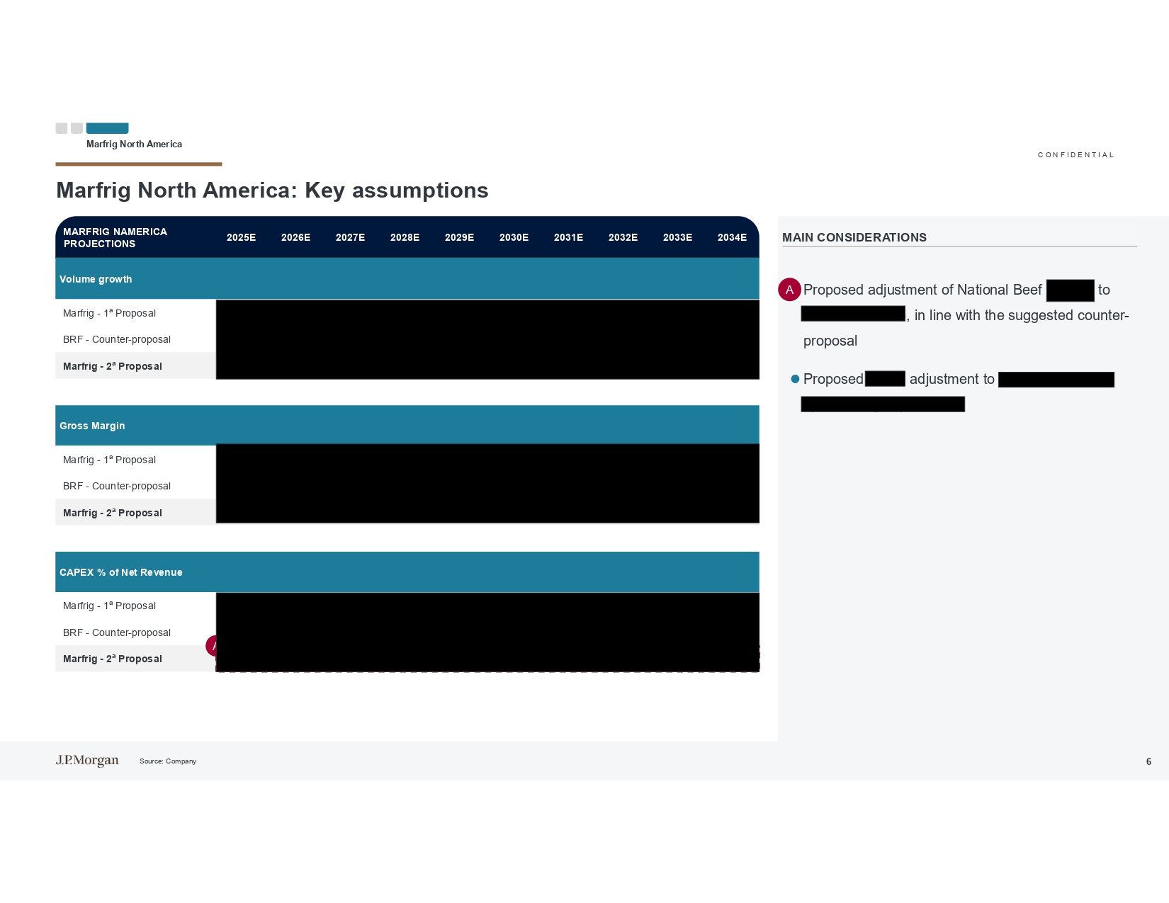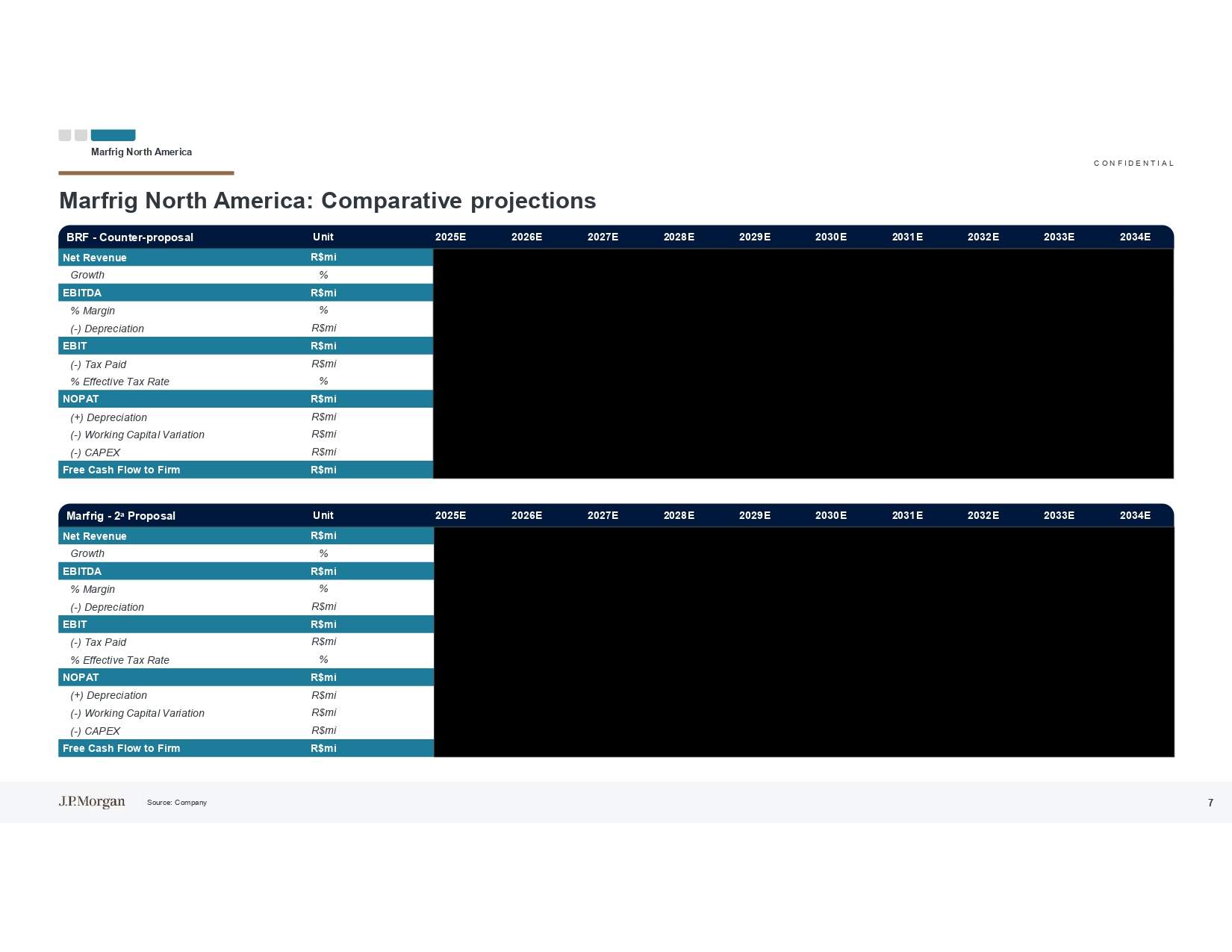 C O N F I D E N T I A L Marfrig North America:关键假设主要考虑CAPEX为收入的1.5%,符合建议的反提案•建议的PP & E调整以去除BRF升级,影响折旧2034E 2033E 2032E 2031E 2030E 2029E 2028E 2027E 2026E 2025E MARFRIG NAMERICA Projections Volume Growth 1.5% 2.0% 3.0% 3.5% 4.0% 4.5% 3.1%(0.7%)(3.3%)1.5% Marfrig-1 a Proposal 0.0% 0.0% 0.0% 0.0% 4.5% 3.1%(0.7%)(3.3%)1.5% BRF-Counter-Proposal 1.5% 2.0% 3.0% 3.5% 4.0% 4.5% 3.1%(0.7%)(3.3%)1.5% Marfrig-2 a Proposal Gross Margin 9.8% 11.9% 11.3% 10.8% 10.2% 7.9% 6.3% 3.5% 3.5% 3.7% Marfrig-1 a Proposal 7.1% 7.1% 7.1% 7.2% 7.1% 7.1%6.3% 3.5% 3.5% 3.7% Marfrig-2 a提案CAPEX占净收入的百分比0.9% 0.9% 0.9% 0.9% 0.9% 0.9% 0.9% 0.9% 0.9% 0.9% Marfrig-1 a提案1.5% 1.5% 1.5% 1.5% 1.5% 1.5% 1.5% 1.5% 1.5% 1.5% 1.5% 1.5% 1.5% 1.5% 1.5% BRF-反-提案1.5% 1.5% 1.5% 1.5% 1.5% 1.5% 1.5% 1.5% 1.5% 1.5% 1.5% 1.5% 1.5% Marfrig-2 a提案Marfrig North America A •建议调整国家牛肉来源:公司6