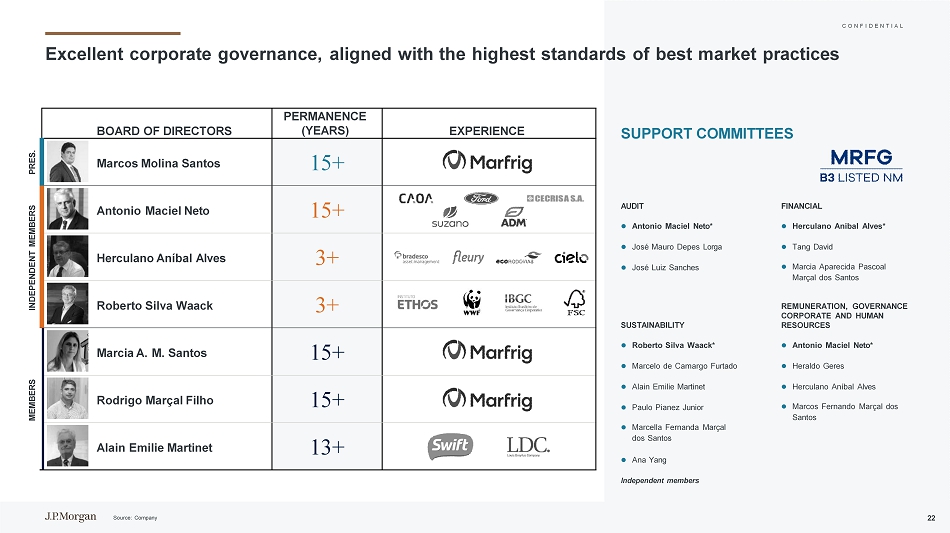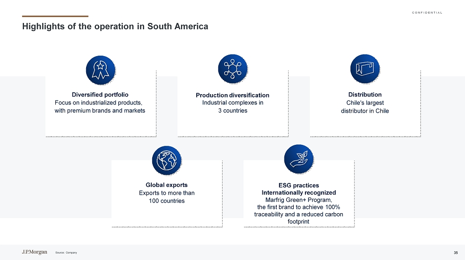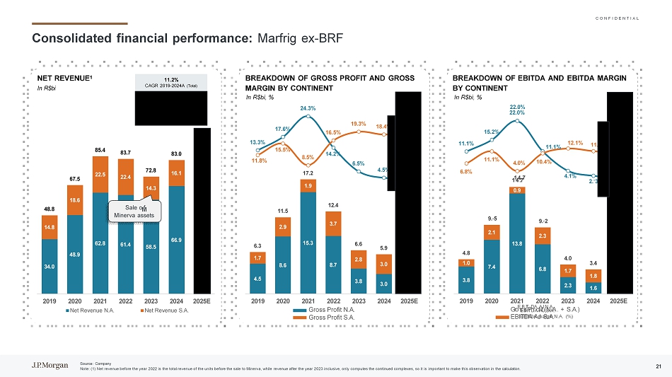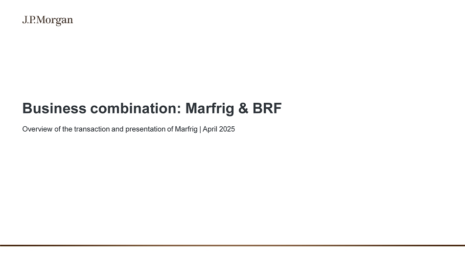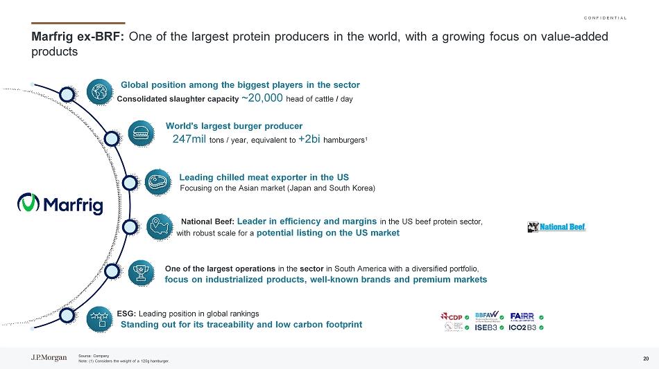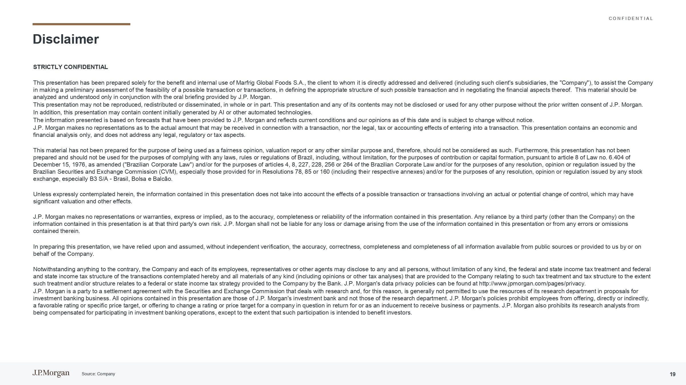 C O N F I D E N T I A L资料来源:公司19免责声明高度机密本演示文稿仅为Marfrig Global Foods S.A.的利益和内部使用而编制,Marfrig Global Foods S.A.是直接向其发送和交付的客户(包括该客户的子公司,“公司”),以协助公司对一项或多项可能交易的可行性进行初步评估,确定该可能交易的适当结构,并就其财务方面进行谈判。仅应结合摩根大通提供的口头简报来分析和理解这些材料。本演示文稿不得全部或部分复制、重新分发或传播。未经摩根大通事先书面同意,不得披露本演示文稿及其任何内容或将其用于任何其他目的。此外,此演示文稿可能包含最初由AI或其他自动化技术生成的内容。所提供的信息基于向摩根大通提供的预测,反映了当前状况和我们截至该日期的意见,如有更改,恕不另行通知。摩根大通不对可能收到的与交易有关的实际金额作出任何陈述,也不对达成交易的法律、税务或会计影响作出任何陈述。本演示文稿仅包含经济和财务分析,不涉及任何法律、监管或税务方面。本材料并不是为了用作公允性意见、估值报告或任何其他类似目的而编制的,因此,不应被视为公允意见、估值报告或任何其他类似目的。此外,根据经修订的1976年12月15日第6.404号法律第8条(“巴西公司法”)和/或巴西公司法第4、8、227、228、256或264条和/或巴西证券交易委员会(CVM)发布的任何决议、意见或条例,特别是第78号决议规定的决议、意见或条例,本演示文稿并未编制,也不应用于遵守巴西的任何法律、规则或条例的目的,包括但不限于为出资或资本形成的目的,A. 85或160(包括其各自的附件)和/或为任何证券交易所发布的任何决议、意见或条例的目的,特别是B3 S/A-Brasil、Bolsa e Balc ã o。除非在此明确设想,本演示文稿中包含的信息未考虑可能的交易或涉及实际或潜在控制权变更的交易的影响,这些交易可能具有重大估值和其他影响。摩根大通不对本演示文稿所载信息的准确性、完整性或可靠性作出任何明示或暗示的陈述或保证。第三方(公司除外)对本演示文稿所载信息的任何依赖均由该第三方承担风险。摩根大通不对因使用本演示文稿中包含的信息或其中包含的任何错误或遗漏而引起的任何损失或损害承担责任。在编制本演示文稿时,我们依赖并假定,未经独立核实,可从公开来源获得或由公司或代表公司提供给我们的所有信息的准确性、正确性、完整性和完整性。尽管有任何相反的情况,公司及其每一名雇员、代表或其他代理人可向任何和所有人(不限于任何种类)披露在此设想的交易的联邦和州所得税待遇以及联邦和州所得税结构,以及向公司提供的与此种税收待遇和税收结构有关的所有任何种类的材料(包括意见或其他税务分析),只要此种待遇和/或结构与银行向公司提供的联邦或州所得税策略有关。摩根大通的数据隐私政策可查阅http://www.jpmorgan.com/pages/privacy。摩根大通是与美国证券交易委员会(Securities and Exchange Commission)就研究达成和解协议的一方,因此,摩根大通通常不被允许在投资银行业务提案中使用其研究部门的资源。这份报告中包含的所有观点都是摩根大通投行的观点,而不是研究部门的观点。摩根大通的政策禁止员工直接或间接提供有利的评级或特定价格目标,或提议改变相关公司的评级或价格目标,以换取或作为获得业务或付款的诱因。摩根大通还禁止其研究分析师因参与投行业务而获得报酬, 除非此类参与旨在使投资者受益。