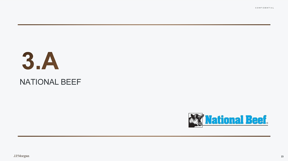 C O N F I D E N T I A L 1% 6% 9% 11% 15% 22% 11% 4% 2% 1% 4% 6% 8% 9% 9% 10% 8% 1% 4% 3% 8% 12% 21% 9% 0% 1% 2% 2% 2% 2% 2% 2% 2% 7% 6% 7% 7% 7% 10% 18% 18% 13% 1% 2012A 2022A 2023A(1%)2024A 90.889.387.789.89 2.09 3.69 4.49 4.49 4.49 1.989.387.2对于National Beef的利润率预测演变NATIONAL BEEF及其在美国市场的主要竞争对手的调整后EBITDA利润率(%)牛肉细分市场1牛肉北美2美国牛库存(#百万头)NB平均有2。5页p。比竞争对手多3个利润率,不考虑周期中的点位(0%)(0%)2013A2014A2015A2016A2017A2018A2019A2020A2021A平均利润率上一个周期(2012-2022年):7.8%/7.0%/6.2% 2025E 2026E 2027E 2028E 2029E 2030E 2031E 2032E 2033E 2034E平均利润率预测周期(2023-2034E):5。对国家牛肉利润率的预测采用了4%的保守假设。预计的平均利润率低于上一个周期的国家牛肉本身及其竞争对手考虑到历史利润率之间的平均价差,泰森和JBS的利润率将分别为4.6%和3.7%,来源:USDA;公司注意:(1)考虑息税前利润率。(2)JBS Beef North America考虑美国、加拿大和澳大利亚的生产结果。截至2022年,该公司开始单独报告JBS澳大利亚。(三)2016年以来16