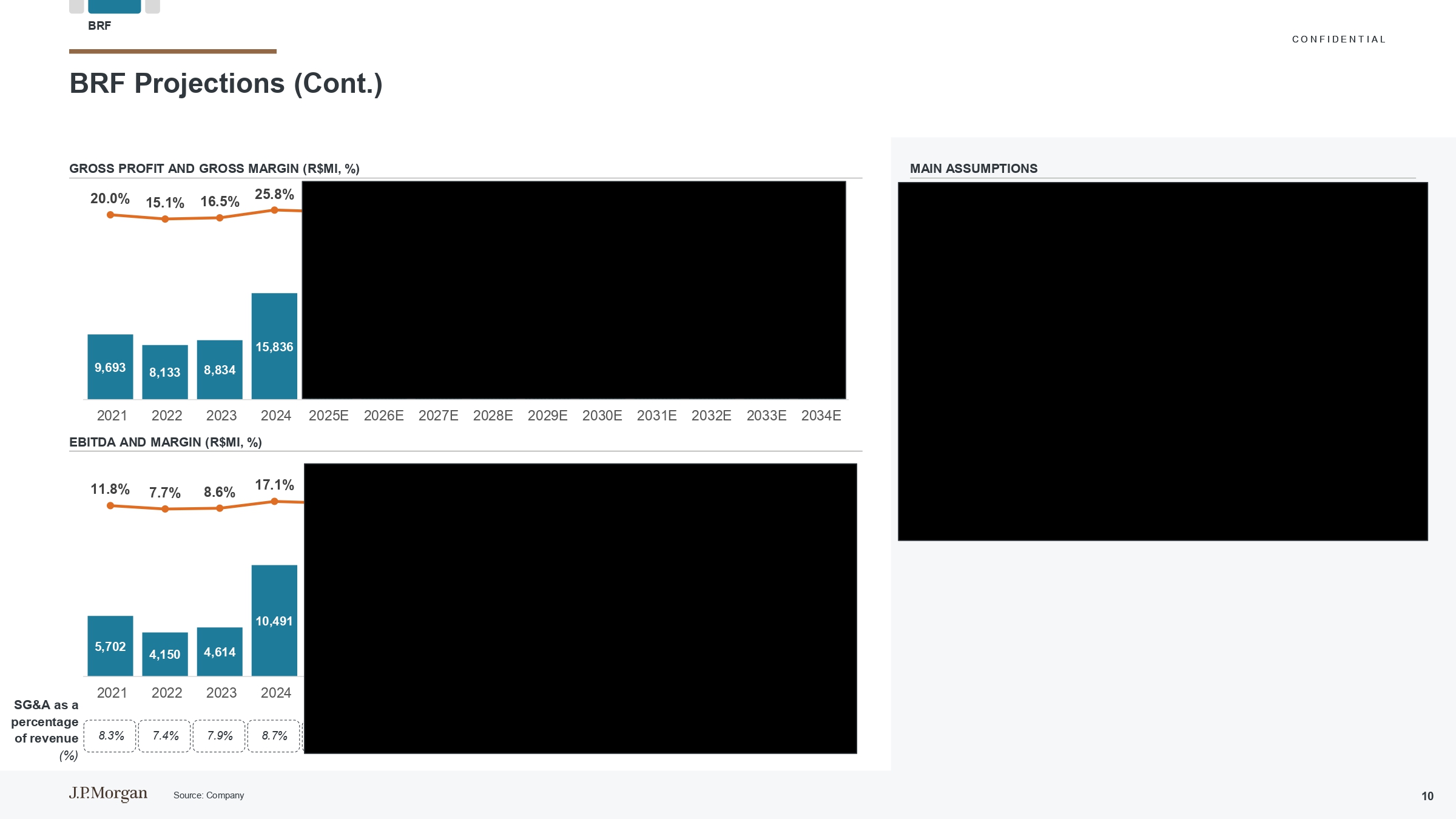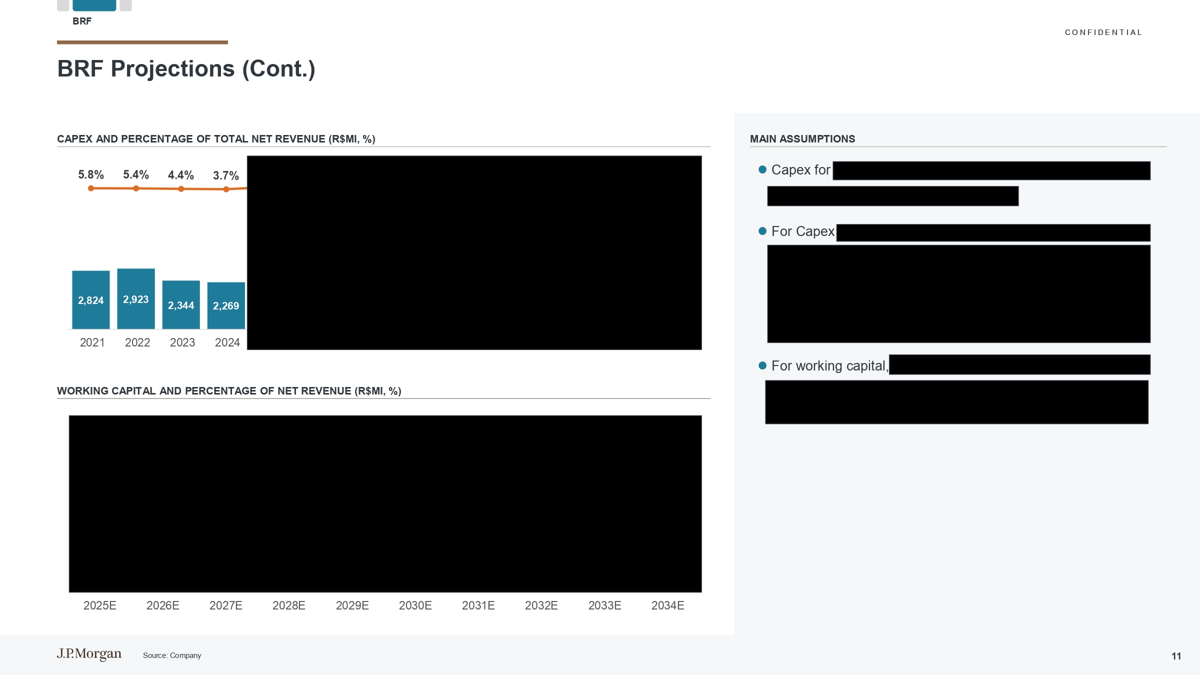 C O N F I D E N T I A L毛利润和毛利率(R $ MI,%)主要假设9,6938,1338,83415,83615,52216,52916,10416,53417,03318,06819,52721,29823,00124,75820.0% 15.1% 16.5% 25.8% 23.7% 23.3% 21.2% 20.6% 19.9% 19.8% 20.0% 20.4% 20.6% 20.8% 2026e2027e2028e2029e2029e2029e2030e2031e2032e2033e2034e2034e鉴于在执行过去两年实施的卓越运营计划后达到的盈利水平正常化,预计公司的利润率将小幅下降,从而获得了显着的效率提升并产生了强劲的利润率扩张BRF新的董事会和高管的卓越管理已将收入从2023年的540亿雷亚尔(EBITDA利润率为8.6%)提高到2024年的610亿雷亚尔(EBITDA利润率为17.1%)。这些结果已将公司定位于正常化水平,对未来长期持续受益的预期,预计将保持稳定的增长轨迹,在有利的周期位置内不发生重大变化,对利润率正常化的BRF预测(续)20212022202320242025E EBITDA和利润率(R $ MI,%)5,7024,1504,61410,4919,85510,3809,4879,5149,56010,08711,00312,19313,27614,37211.8% 7.7% 8.6% 17.1% 15.1% 14.6% 12.5% 11.8% 11.2% 11.0% 11.3% 11.7% 11.9% 12.1% 20212022202320242025E 2026E 2027E 2028E 2029E 2030E 2031E 2032E 2033E 2034E SG & A占收入的百分比(%)8.3% 7.4% 7.9% 8.7% 8.7% 8.7% 8.7% 8.7% 8.7% 8.7% 8.7% 8.7% 8.7% 8.7% 8.7% 8.7% 8.7% 8.7% 8.7% 8.7% BRF资料来源:公司10