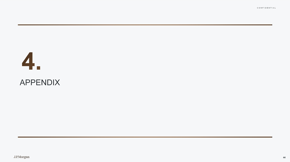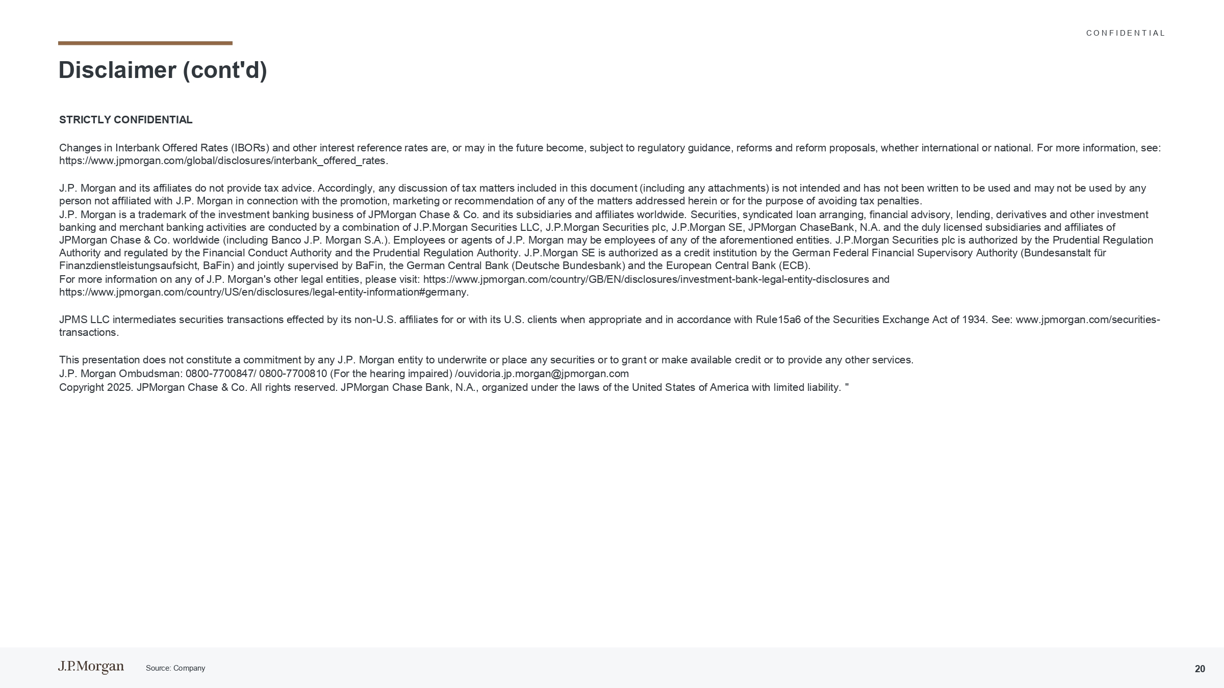C O N F I D E N T I A L来源:公司20免责声明(续)银行间同业拆借利率(IBOR)和其他利率参考利率的严格保密变化正在或可能在未来成为受监管指导、改革和改革建议的约束,无论是国际的还是国家的。更多信息见:https://www.jpmorgan.com/global/disclosures/interbank _ offered _ rates。摩根大通及其关联公司不提供税务建议。因此,本文件(包括任何附件)中所包含的任何关于税务事项的讨论并非旨在也没有被书面用于,也不得被与摩根大通无关的任何人用于与本文所述任何事项的推广、营销或推荐有关或用于避免税务处罚的目的。J.P. Morgan是摩根大通公司及其在全球的子公司和关联公司投资银行业务的商标。证券、银团贷款安排、财务顾问、借贷、衍生品和其他投资银行业务和商业银行业务活动由J.P.Morgan Securities LLC、J.P.Morgan Securities plc、J.P.Morgan SE、JPMorgan ChaseBank,N.A.以及摩根大通 & Co. worldwide(包括Banco J.P. Morgan S.A.)的正式许可子公司和关联公司进行。摩根大通的雇员或代理人可能是上述任何实体的雇员。摩根大通证券有限公司由审慎监管局授权,受金融行为监管局和审慎监管局监管。J.P.Morgan SE由德国联邦金融监管局(Bundesanstalt f ü r Finanzdienstleistungsaufsicht,BaFin)授权为信贷机构,由BaFin、德国中央银行(Deutsche Bundesbank)和欧洲中央银行(ECB)共同监管。欲了解有关摩根大通其他任何法律实体的更多信息,请访问:https://www.jpmorgan.com/country/gb/en/disclosures/investment-bank-legal-entity-disclosures和https://www.jpmorgan.com/country/us/en/disclosures/legal-entity-information # Germany。JPMS LLC在适当时根据1934年《证券交易法》第15a6条规则,为其非美国关联公司为其美国客户或与其美国客户进行的证券交易提供中介服务。见:www.jpmorgan.com/securities-transactions。本演示文稿不构成任何摩根大通实体承销或配售任何证券或授予或提供信贷或提供任何其他服务的承诺。摩根大通申诉专员:0800-7700847/0800-7700810(听障人士)/ouvidoria.jp.morgan@jpmorgan.com版权所有2025。摩根大通 & Co.版权所有。摩根大通银行,N.A.,根据美利坚合众国法律组建的有限责任公司。"