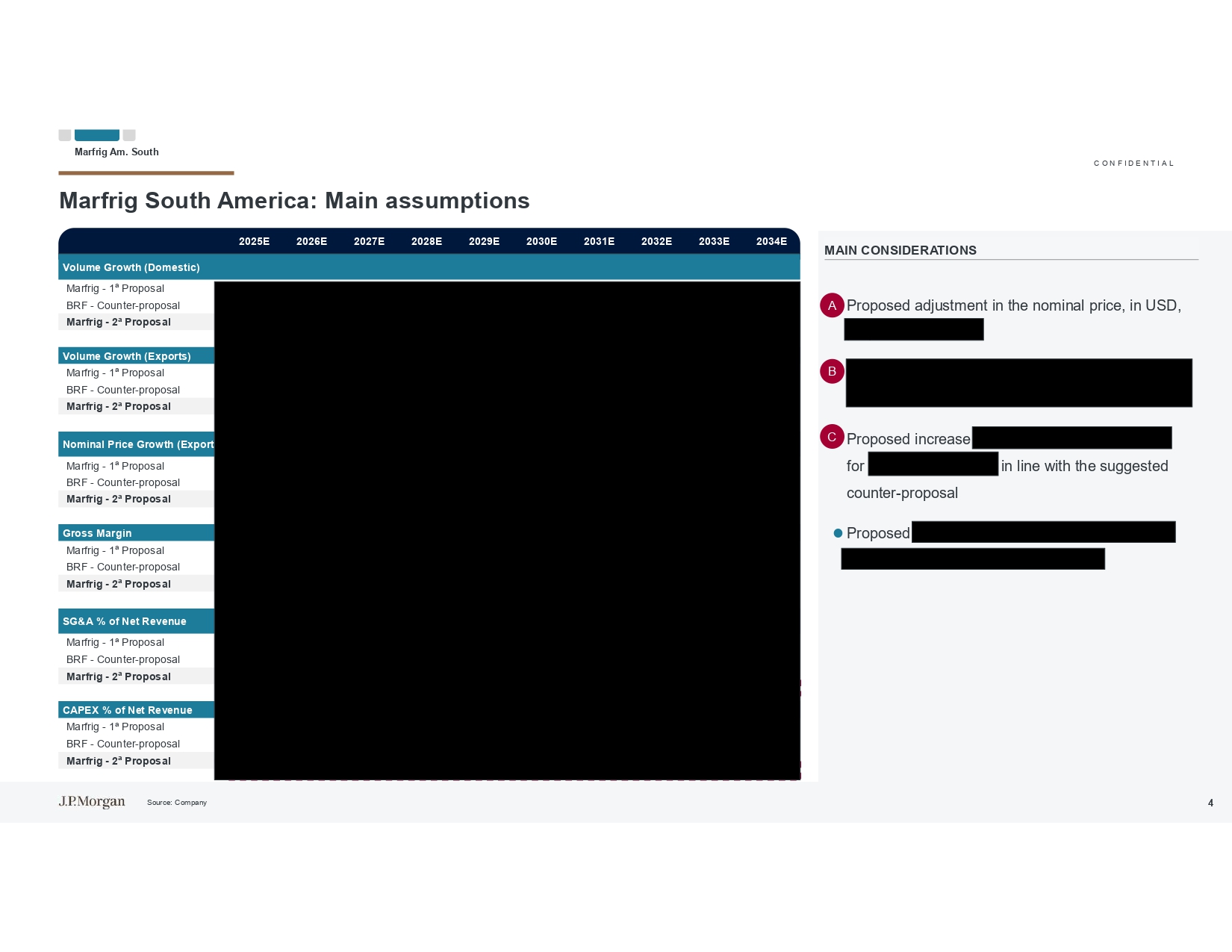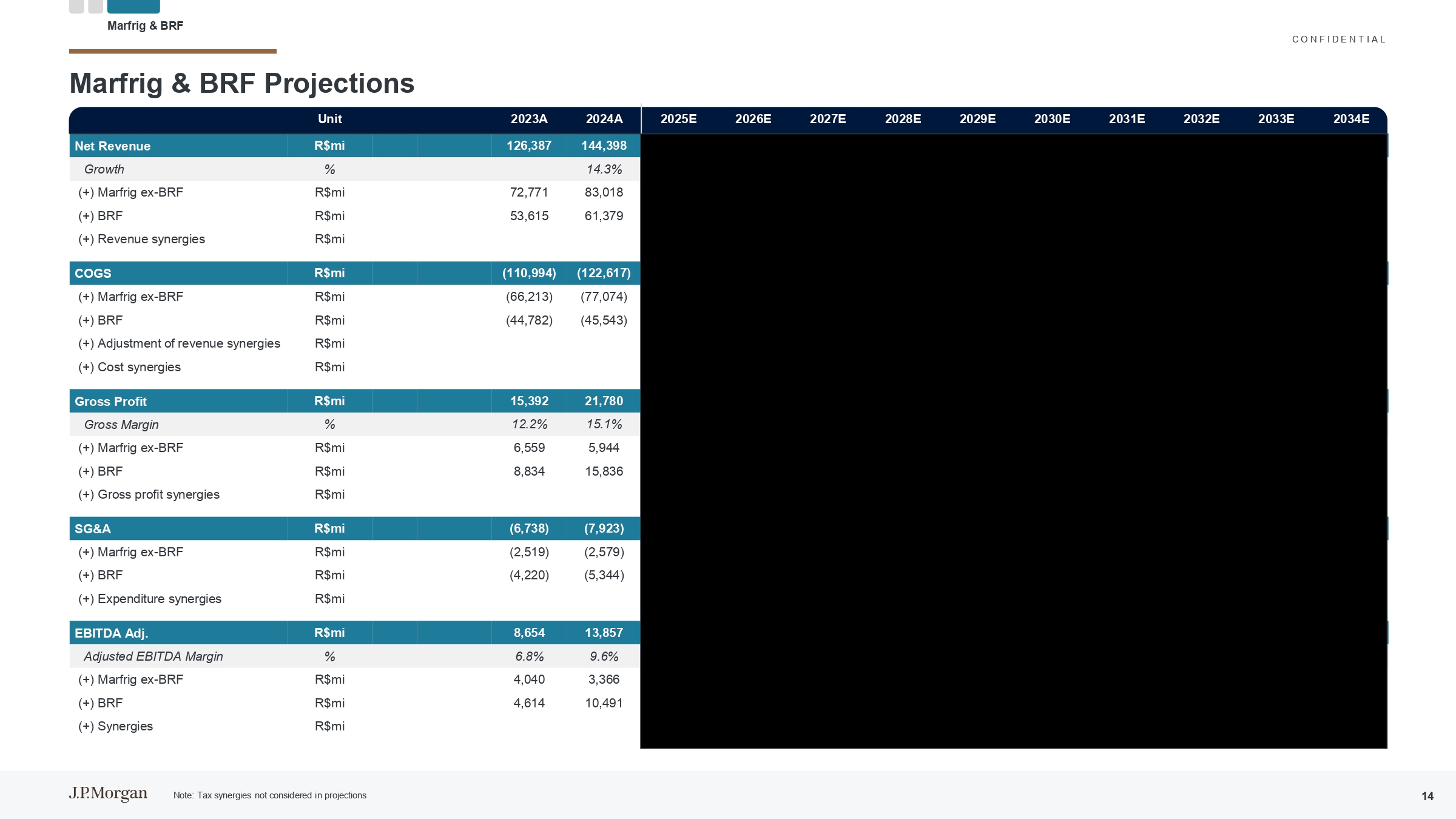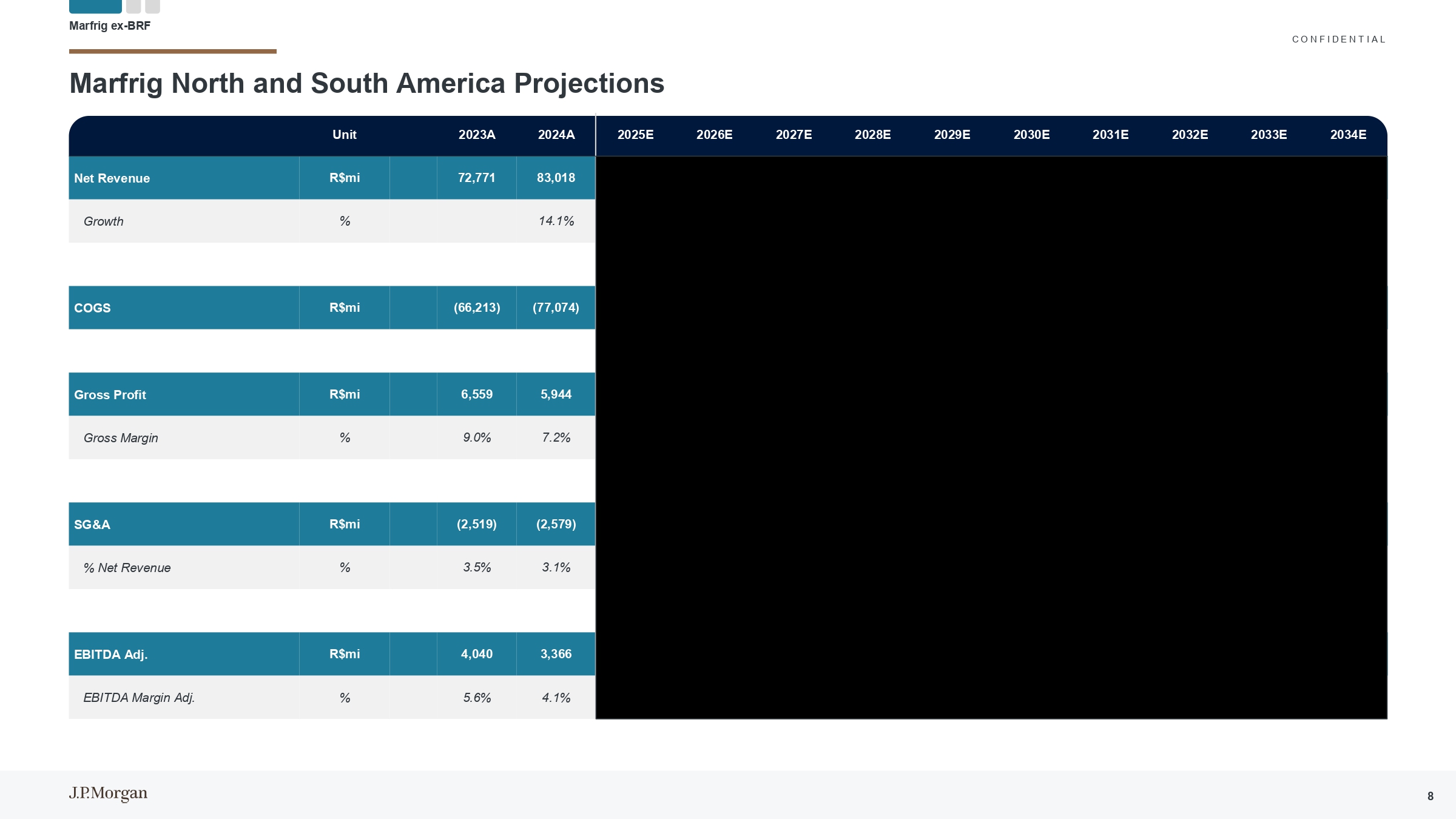 C O N F I D E N T I A L 2034E 2033E 2032E 2031E 2030E 2029E 2028E 2027E 2026E 2025E 2024A 2023A单位160,353151,791143,171134,070125,099116,313113,412108,359104,28695,97483,01872,771 R $ mi净收入5.6% 6.0% 6.8% 7.2% 7.6% 2.6% 4.7% 3.9% 8.7% 15.6% 14.1%增长(142,135)(132,059)(125,143)(117,609)(110,200)(104,371)(103,199)(100,794)(96,591)(89,304)(77,074)(66,213)R $ mi COGS 18,21819,772(4,571)(4,209)(4,013)(3,907)(3,822)(3,957)(3,351)(2,579)(2,519)R $ mi SG & A 3.3% 3.3% 3.3% 3.4% 3.4% 3.4% 3.5% 3.5% 3.5% 3.5% 3.8% 3.5% 3.1% 3.5% %净收入12,84814,67013,21411,89010,6907,9306,3053,7433,7383,3193,3664,040 R $ mi EBITDA Adj. 8.0% 9.7% 9.2% 8.9% 8.5% 6.8% 5.6% 3.5% 3.6% 3.5% 3.5% 4.1% 5.6% EBITDA Margin Adj. Marfrig North and South America Projections Marfrig ex-BRF 8