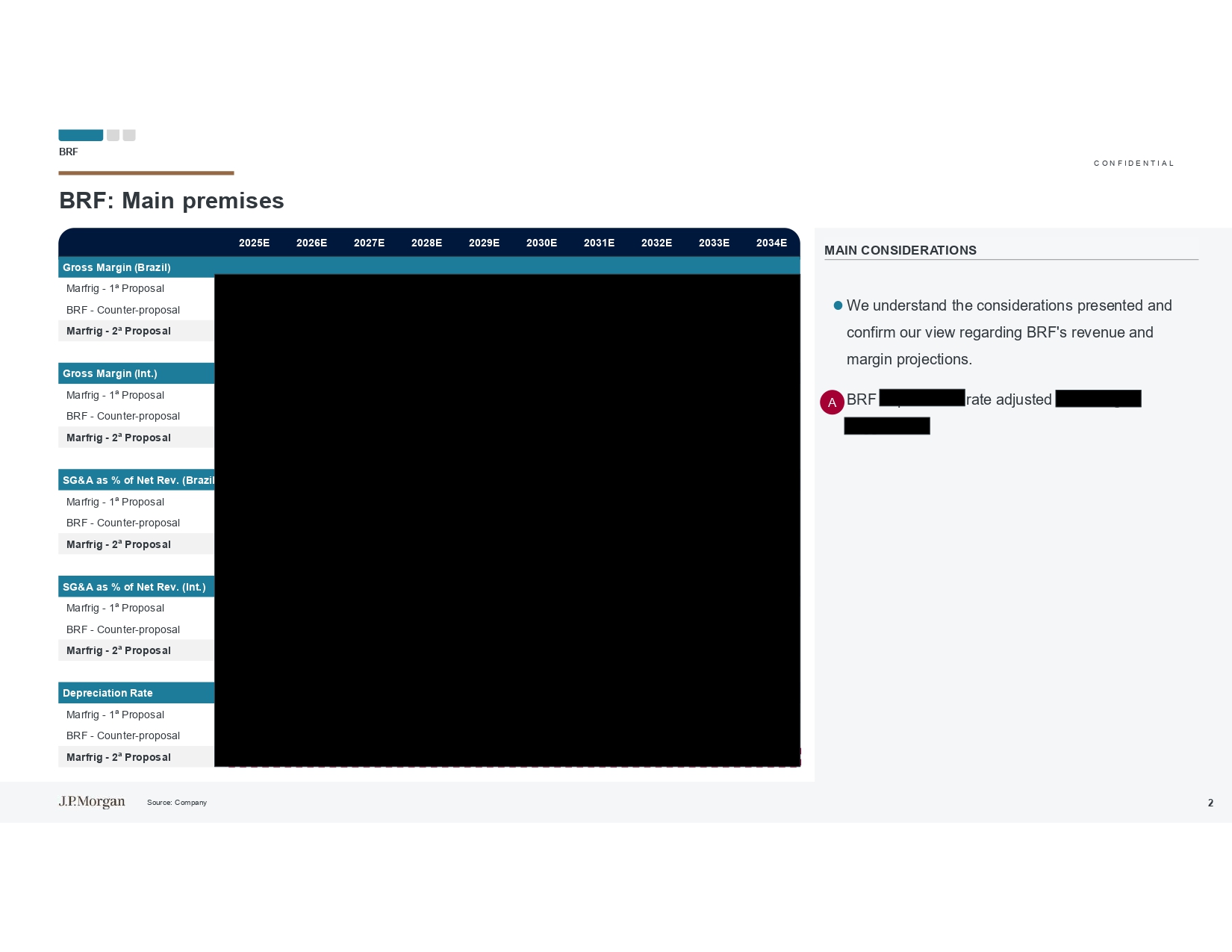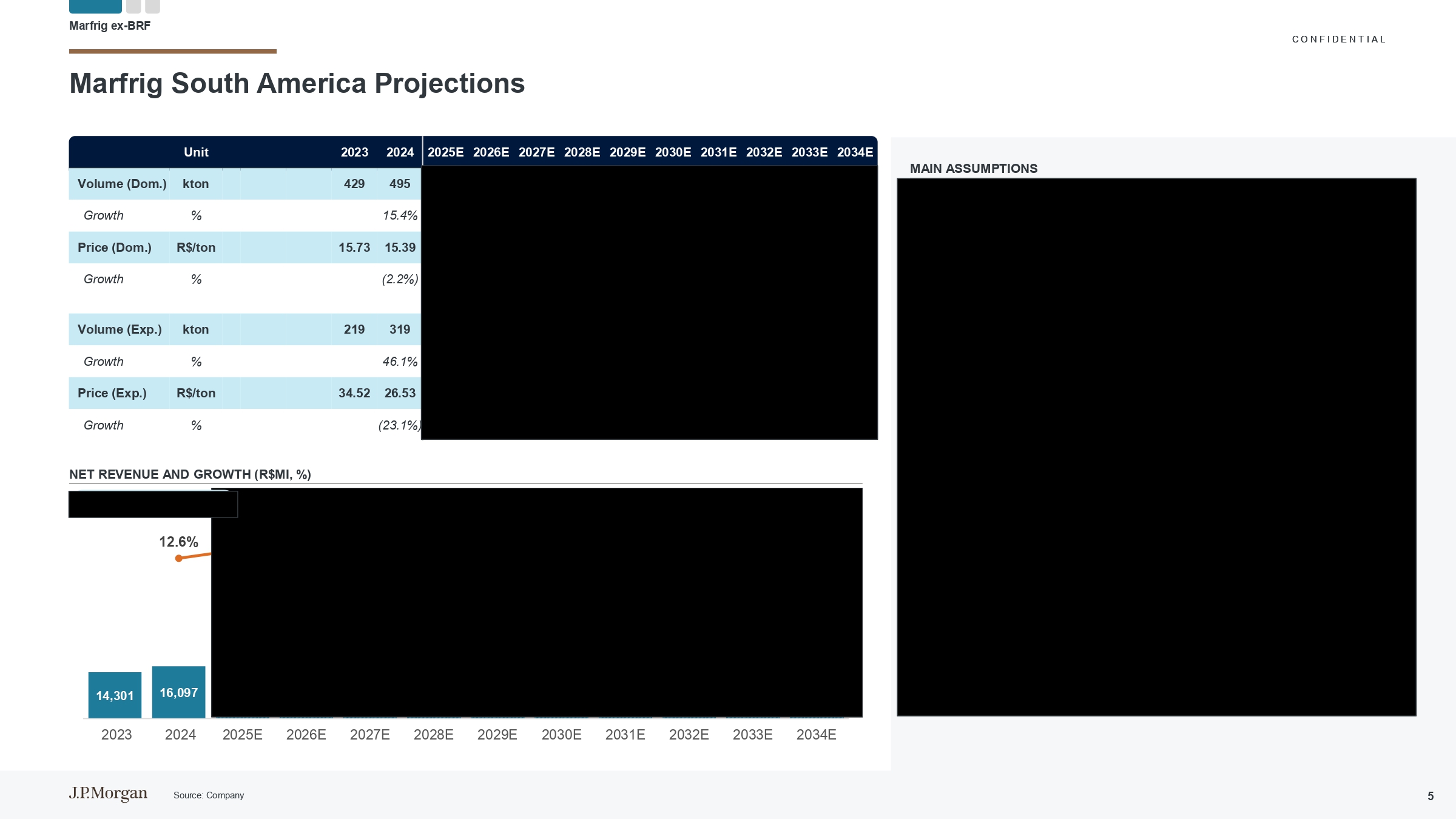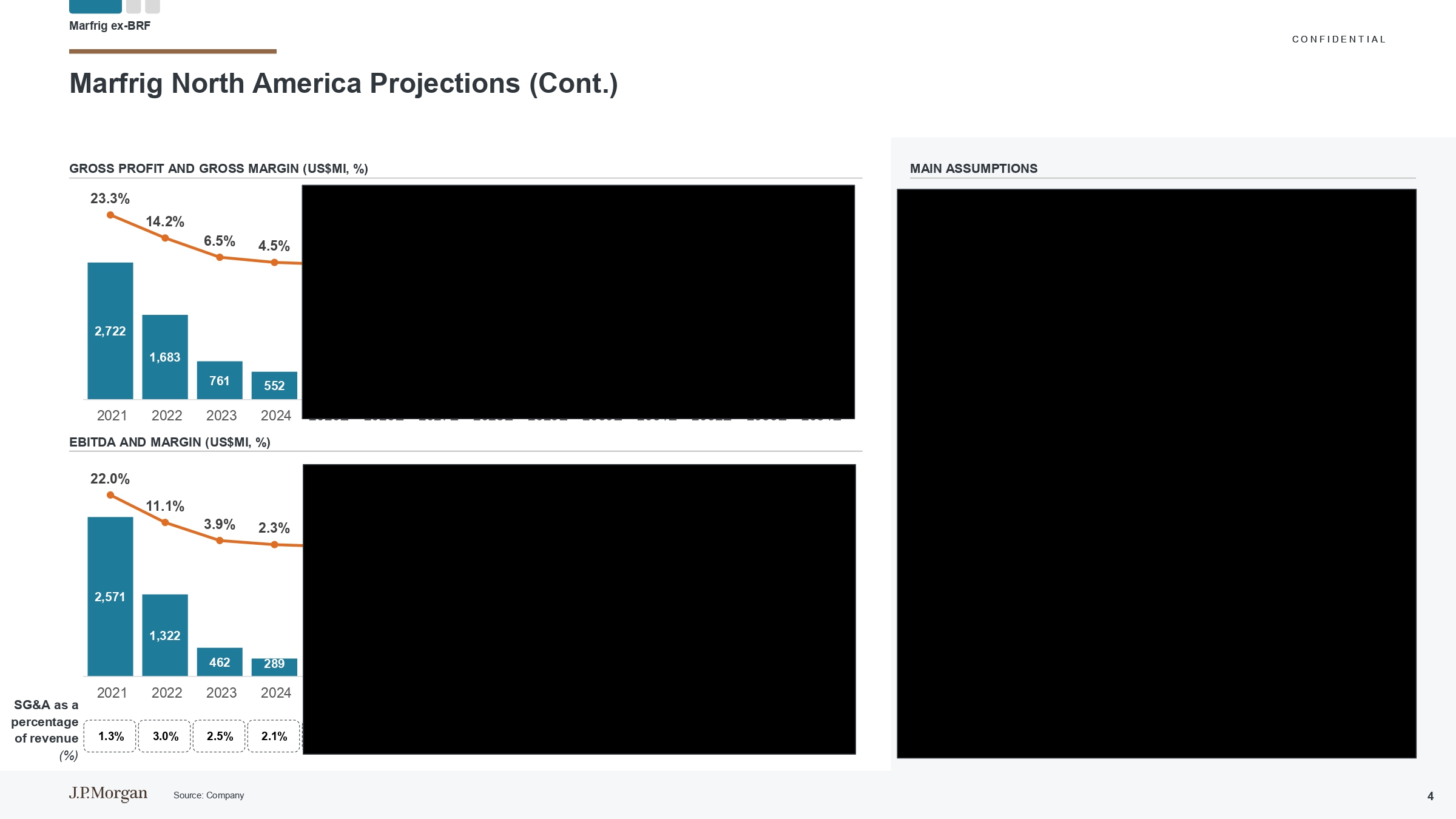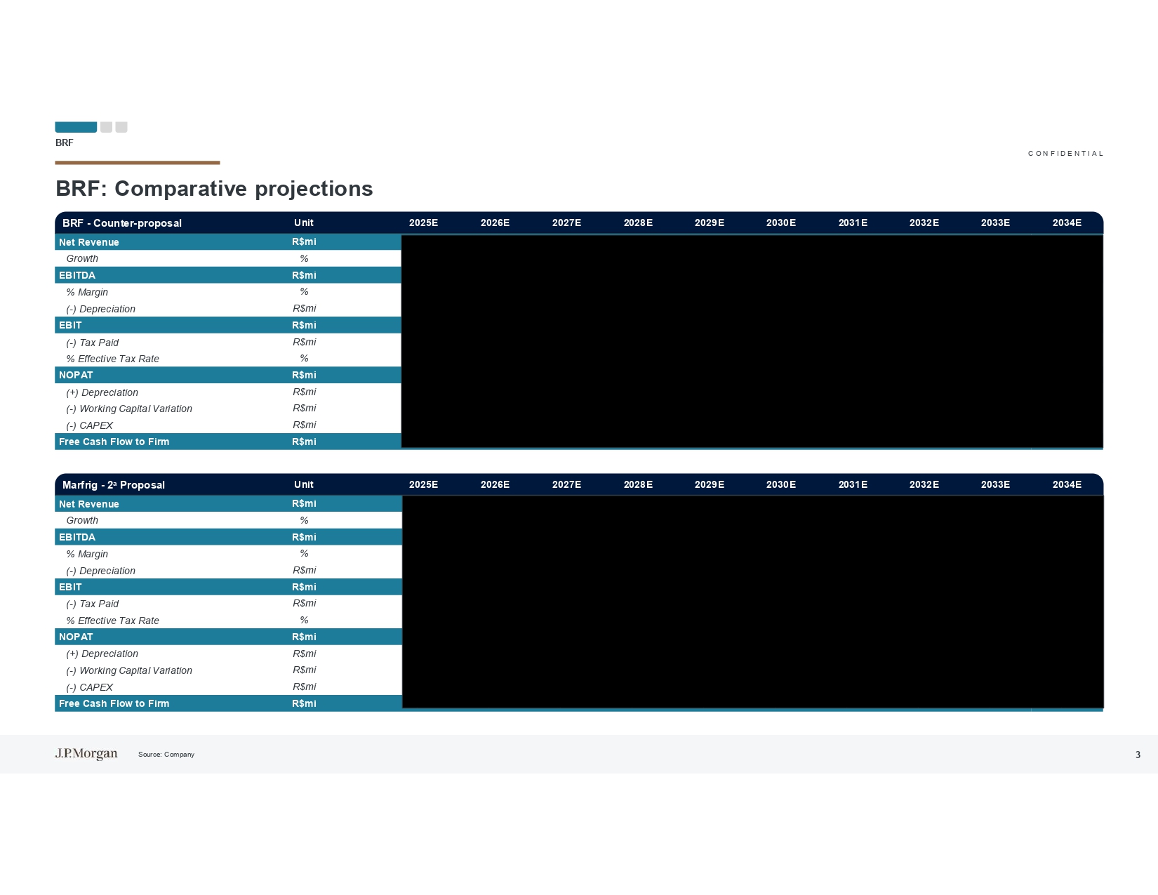 C O N F I D E N T I A L 2034E 2033E 2032E 2031E 2030E 2029E 2028E 2027E 2026E 2025E 2024A 2023A单位160,353151,791143,171134,070125,099116,313113,412108,359104,28695,97483,01872,771 R $ mi净收入5.6% 6.0% 6.8% 7.2% 7.6% 2.6% 4.7% 3.9% 8.7% 15.6% 14.1%增长(142,135)(132,059)(125,143)(117,609)(110,200)(104,371)(103,199)(100,794)(96,591)(89,304)(77,074)(66,213)R $ mi COGS 18,21819,772(4,571)(4,209)(4,013)(3,907)(3,822)(3,957)(3,351)(2,579)(2,519)R $ mi SG & A 3.3% 3.3% 3.3% 3.4% 3.4% 3.4% 3.5% 3.5% 3.5% 3.5% 3.8% 3.5% 3.1% 3.5% %净收入12,84814,67013,21411,89010,6907,9306,3053,7433,7383,3193,3664,040 R $ mi EBITDA Adj. 8.0% 9.7% 9.2% 8.9% 8.5% 6.8% 5.6% 3.5% 3.6% 3.5% 3.5% 4.1% 5.6% EBITDA Margin Adj. Marfrig North and South America Projections Marfrig ex-BRF 8