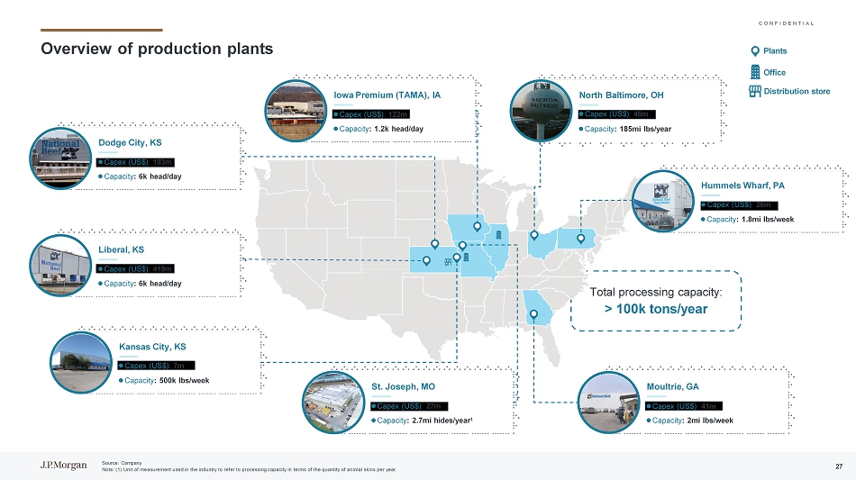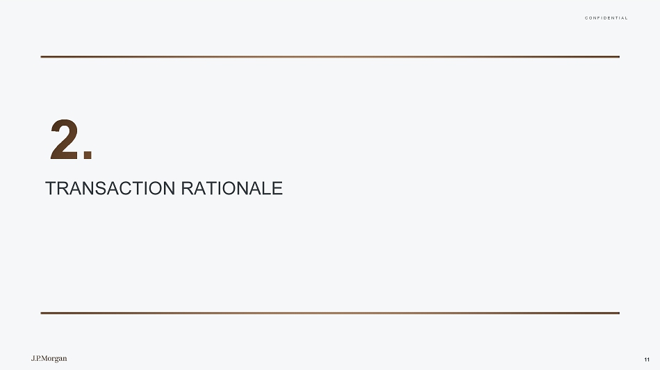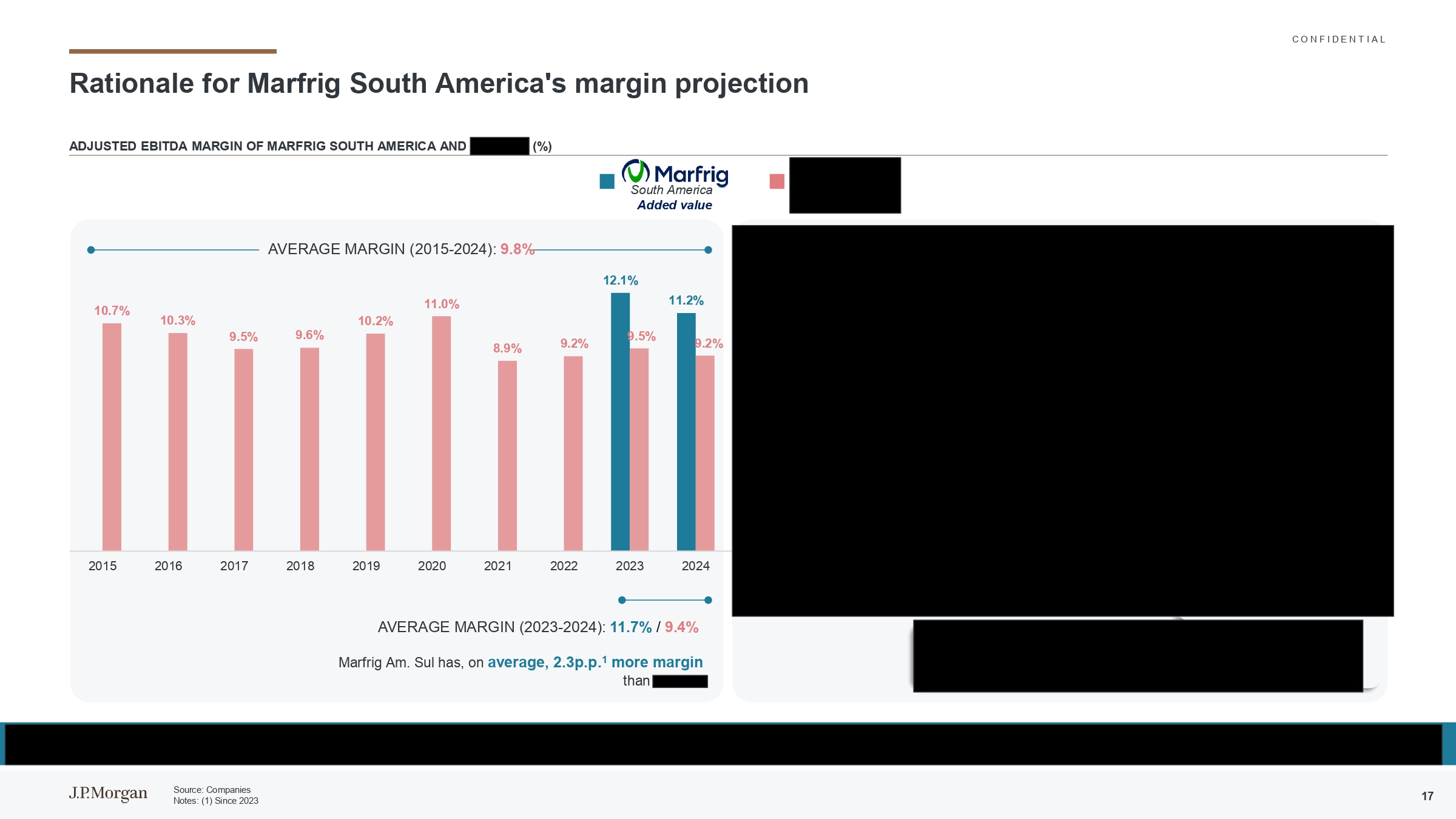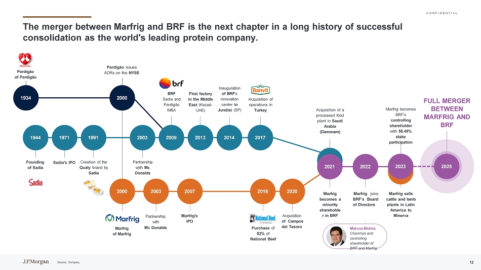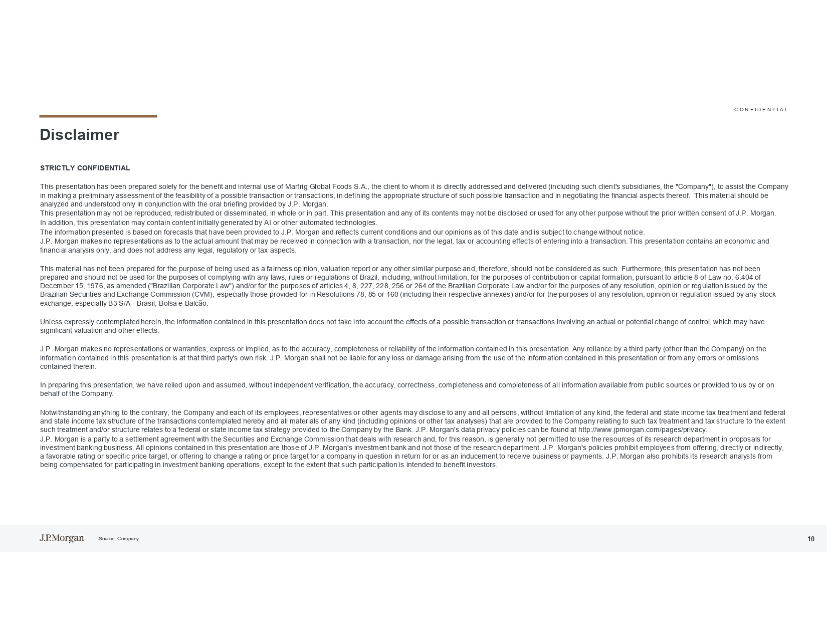 C O N F I D E N T I A L资料来源:公司10免责声明高度机密本演示文稿仅为Marfrig Global Foods S.A.的利益和内部使用而编制,该客户是直接向其发送和交付的客户(包括该客户的子公司,“公司”),以协助公司对一项或多项可能交易的可行性进行初步评估,确定该可能交易的适当结构,并就其财务方面进行谈判。这份材料只应结合摩根大通提供的口头简报进行分析和理解。本演示文稿不得全部或部分复制、重新分发或传播。未经摩根大通事先书面同意,不得披露本演示文稿及其任何内容或将其用于任何其他目的。此外,此演示文稿可能包含最初由AI或其他自动化技术生成的内容。所提供的信息基于已提供给摩根大通的预测,反映了当前状况和我们截至该日期的意见,如有更改,恕不另行通知。摩根大通不对可能收到的与交易有关的实际金额作出任何陈述,也不对达成交易的法律、税务或会计影响作出任何陈述。本演示文稿仅包含经济和财务分析,不涉及任何法律、监管或税务方面。本材料并不是为了用作公允性意见、估值报告或任何其他类似目的而编制的,因此,不应被视为公允意见、估值报告或任何其他类似目的。此外,根据经修订的1976年12月15日第6.404号法律(“巴西公司法”)第8条和/或《巴西公司法》第4、8、227、228、256或264条和/或巴西证券交易委员会(CVM)发布的任何决议、意见或条例,特别是第78号决议规定的决议、意见或条例,本演示文稿并未编制,也不应用于遵守巴西的任何法律、规则或条例的目的,包括但不限于为出资或资本形成的目的,85或160(包括其各自的附件)和/或为任何证券交易所发布的任何决议、意见或法规的目的,特别是B3 S/A-Brasil,Bolsa e Balc ã o。除非在此明确设想,本演示文稿中包含的信息未考虑可能的交易或涉及实际或潜在控制权变更的交易的影响,这些交易可能具有重大的估值和其他影响。摩根大通不对本演示文稿所载信息的准确性、完整性或可靠性作出任何明示或暗示的陈述或保证。第三方(公司除外)对本演示文稿所载信息的任何依赖均由该第三方承担风险。摩根大通不对因使用本演示文稿中包含的信息或其中包含的任何错误或遗漏而引起的任何损失或损害承担责任。在编制本演示文稿时,我们依赖并假定,在未经独立核实的情况下,从公开来源获得或由公司或代表公司提供给我们的所有信息的准确性、正确性、完整性和完整性。尽管有任何相反的情况,公司及其每一名雇员、代表或其他代理人可向任何和所有人(不限于任何种类)披露本协议所设想的交易的联邦和州所得税待遇以及联邦和州所得税结构,以及向公司提供的与此类税收待遇和税收结构有关的所有任何种类的材料(包括意见或其他税务分析),只要此类待遇和/或结构与银行向公司提供的联邦或州所得税策略有关。J. P. Morgan的数据隐私政策可查阅http://www.jpmorgan.com/pages/privacy。摩根大通是与美国证券交易委员会(Securities and Exchange Commission)就研究达成和解协议的一方,因此,摩根大通通常不被允许在投资银行业务提案中使用其研究部门的资源。这份报告中包含的所有观点都是摩根大通投行的观点,而不是研究部门的观点。摩根大通的政策禁止员工直接或间接提供有利的评级或特定价格目标,或提议改变相关公司的评级或价格目标,以换取或作为获得业务或付款的诱因。摩根大通还禁止其研究分析师因参与投行业务而获得报酬, 除非此类参与旨在使投资者受益。