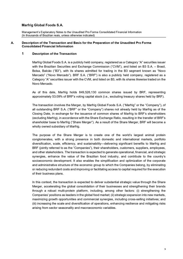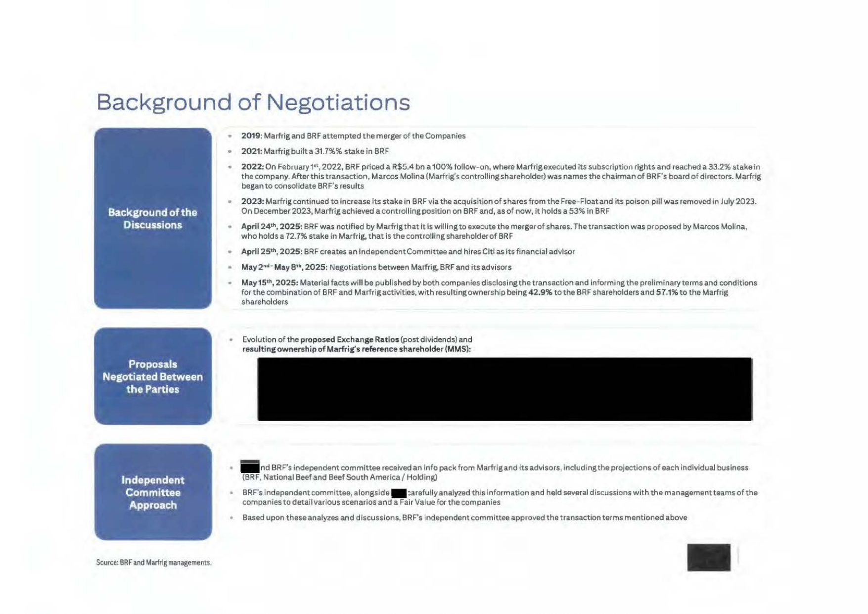 | (一) | 批准《将BRF S.A.股份吸收合并为Marfrig Global Foods S.A.之吸收合并预案》(“合并计划”),该公司与Marfrig Global Foods SA(“MGF”)于2025年5月15日订立,该协议确立了根据巴西第6,404/1976号联邦法(“巴西公司法”)第252条(“合并”)规定的MGF(MGF持有的股份除外)将所有由MGF发行的股份纳入公司的条款和条件; |