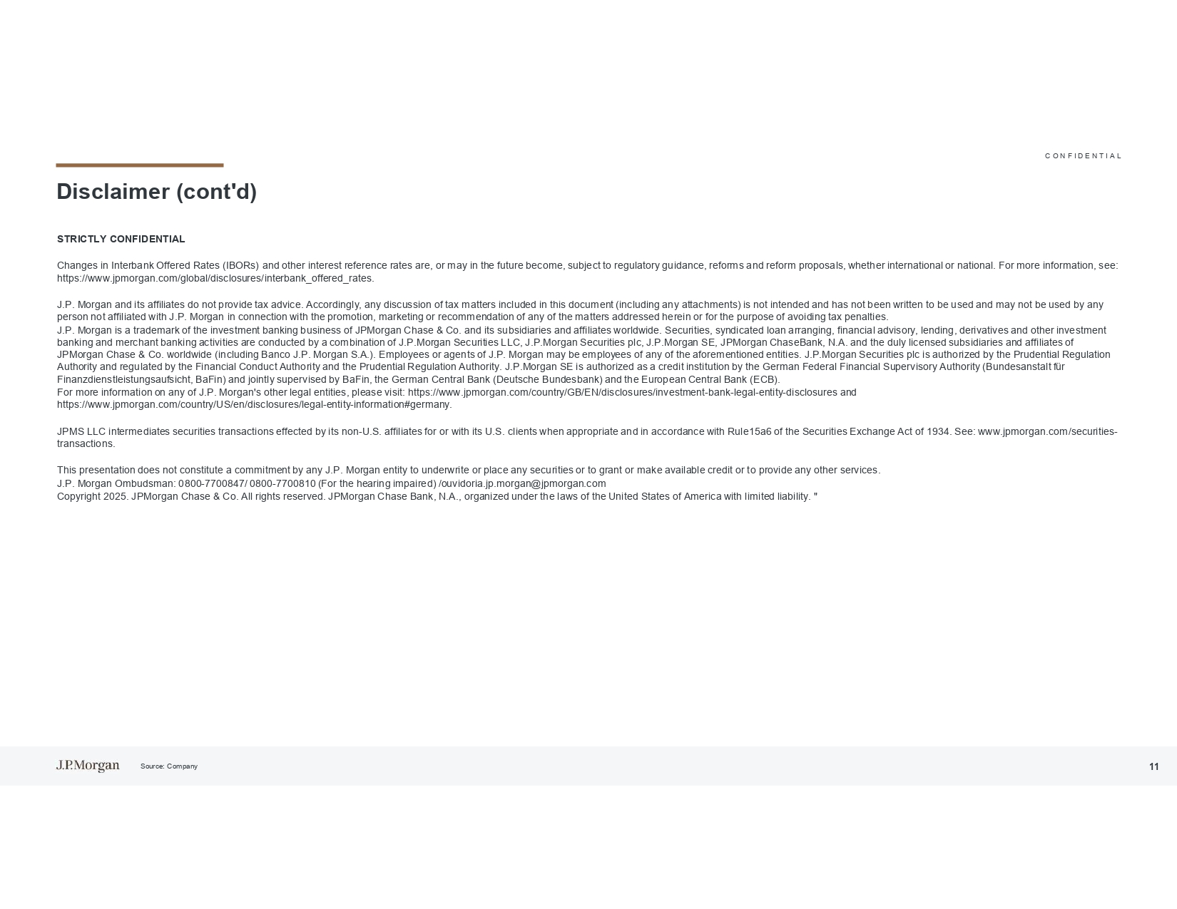 C O N F I D E N T I A L来源:公司11免责声明(续)严格保密银行间同业拆借利率(IBOR)和其他利率参考利率的变化正在或可能在未来成为受监管指导、改革和改革建议的约束,无论是国际的还是国家的。更多信息见:https://www.jpmorgan.com/global/disclosures/interbank _ offered _ rates。摩根大通及其关联公司不提供税务建议。因此,本文件(包括任何附件)中所包含的任何关于税务事项的讨论并非旨在也没有被书面用于任何与摩根大通没有关联的人,也不得用于与本文所述任何事项的推广、营销或推荐有关或用于避免税务处罚的目的。J.P. Morgan是摩根大通公司及其在全球的子公司和关联公司投资银行业务的商标。证券、银团贷款安排、财务顾问、借贷、衍生品和其他投资银行业务和商业银行业务活动由J.P.Morgan Securities LLC、J.P.Morgan Securities plc、J.P.Morgan SE、JPMorgan ChaseBank,N.A.以及摩根大通 & Co. worldwide(包括Banco J.P. Morgan S.A.)的正式许可的子公司和关联公司进行。摩根大通的雇员或代理人可能是上述任何实体的雇员。J.P.Morgan Securities plc由英国审慎监管局授权,受金融行为监管局和英国审慎监管局监管。摩根大通SE由德国联邦金融监管局(Bundesanstalt f ü r Finanzdienstleistungsaufsicht,BaFin)授权为信贷机构,由BaFin、德国中央银行(Deutsche Bundesbank)和欧洲中央银行(ECB)共同监管。欲了解有关摩根大通其他任何法律实体的更多信息,请访问:https://www.jpmorgan.com/country/gb/en/disclosures/investment-bank-legal-entity-disclosures和https://www.jpmorgan.com/country/us/en/disclosures/legal-entity-information # Germany。JPMS LLC在适当时并根据1934年《证券交易法》第15a6条规则,为其非美国关联公司为其美国客户或与其美国客户进行的证券交易提供中介服务。见:www.jpmorgan.com/securities-transactions。本演示文稿不构成任何摩根大通实体承销或配售任何证券或授予或提供信贷或提供任何其他服务的承诺。摩根大通申诉专员:0800-7700847/0800-7700810(听障人士)/ouvidoria.jp.morgan@jpmorgan.com版权所有2025。摩根大通公司版权所有。摩根大通银行,N.A.,根据美利坚合众国法律组建的有限责任公司。"