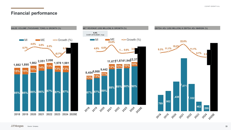 C O N F I D E N T I A L 7899821,438,5712,32214622892079.3% 11.1% 15.2% 22.0% 11.1% 4.1% 2.3% 1.5% 85% 85% 85% 86% 87% 87% 87% 15% 15% 15% 14% 13% 13% 13% 1,8821,8951,9822,0512,0981,9812,0 1,0 1 10.7% 4.6% 3.5% 2.3%(5.7%)0.2% 1.5% 2018201920202021202220232024 2025E MI ME增长(%)87% 87% 89% 88% 88% 90% 90% 13% 13% 11% 12% 12% 10% 8,4548,8689,44211,67311,87411、94912、37212,9864.9% 6.5% 1…0.6% 3.5% 5.0% MI ME 23.6%增长(%)财务业绩EBITDA ADJ(百万美元)& EBITDA ADJ利润率(%)净收入(百万美元)&增长(%)销售量(千吨)&增长(%)6.4% CAGR2018-2024A(总)资料来源:公司33