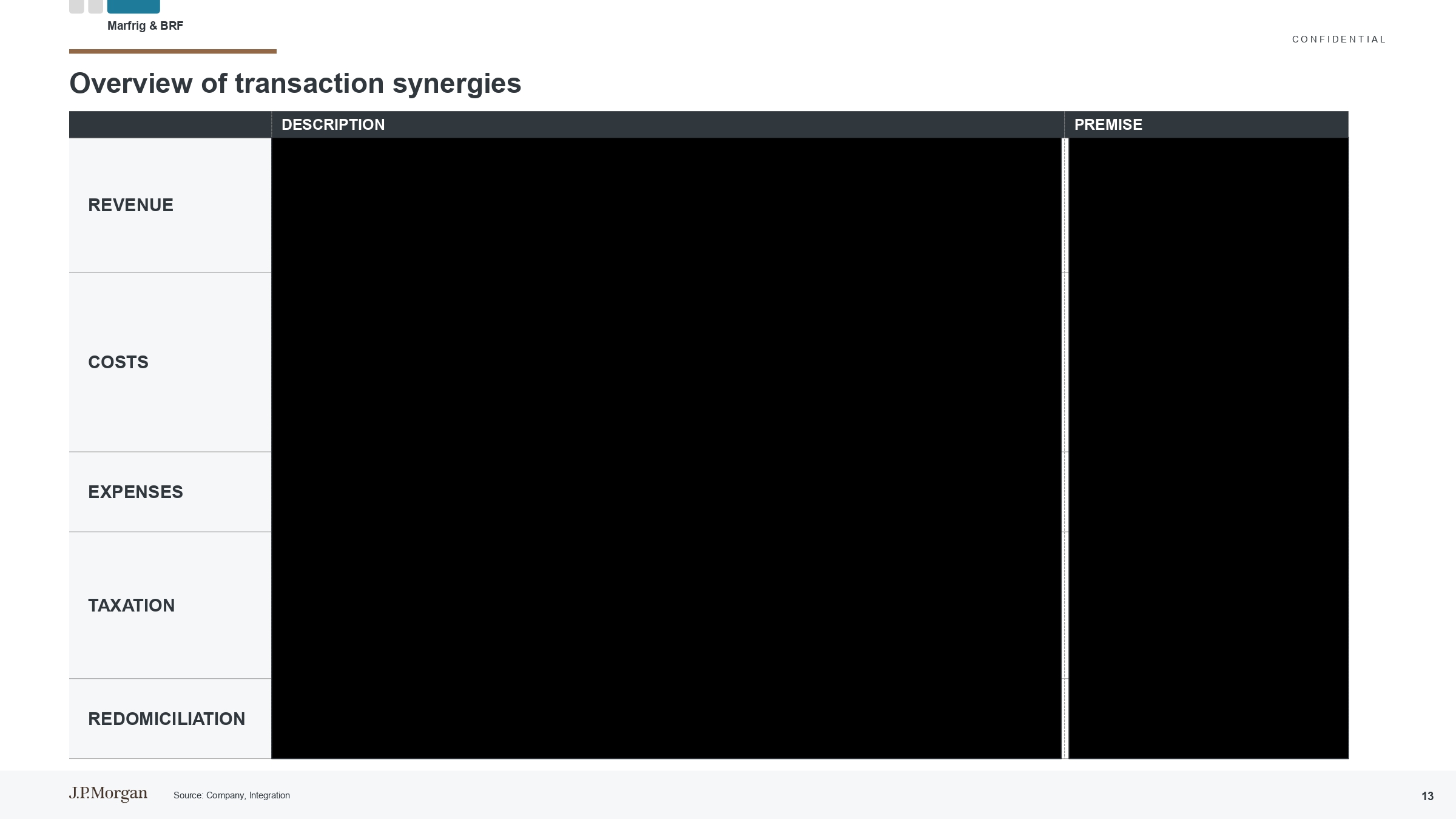 C O N F I D E N T I A L交易协同效应概述前提描述收入协同效应长期内达到BRF收入的5%巴西:食品服务和零售部门的交叉销售协同效应,通过销售效率和潜在的边际销量收益对公司的营业额产生积极影响国际:扩大蛋白质出口到不同市场,尤其是美国。由于国家牛肉的存在,对市场的广泛了解将是BRF加速且高度可扩展地进入该国的催化剂。收入成本协同效应2025-2027年达到BRF收入的1.0%,2028-2030年达到0.5%采购成本:直接采购、间接采购和海运费的协同效应,重点是通过提高效率和取消保单来降低成本物流成本:整合分销业务和运费谈判,从而显着节省公司和持有成本:NewCo的组织重组和持有成本的降低,产生了大量的节省即食食品:使用牛投入来提高即食食品生产的利润率,在不显着增加数量成本的情况下,费用协同效应在2025-2027年达到BRF收入的1.0%,从2028-2030年达到0.5%,此后随通货膨胀而增长SG & A:优化商业和管理费用支出的潜在协同效应-税收抵免ICMS:通过联合运营,公司可以优化使用各自在某些州单独拥有的ICMS抵免IRPJ:在Marfrig对BRF公司的潜在合并中,可以使用要收回的IRPJ抵免,无限制期税收-实现潜在的迁移:两家公司的合并是一个变革性的步骤,扩大了规模和地域多元化,创建了一个具有标志性品牌的多蛋白平台。这种结合将促进重新定位,利用强大的品牌认知度和在美国市场的强大影响力,为我们的成功和全球领导地位的未来定位。REDOMILIATION Marfrig & BRF来源:公司,集成13