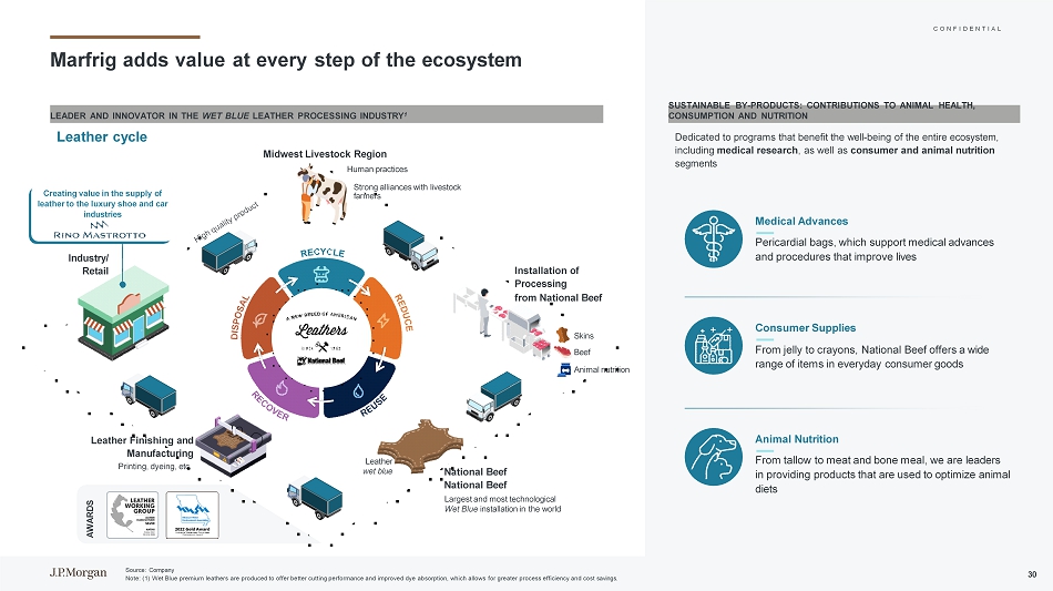 C O N F I D E N T I A L Marfrig在生态系统的每一步都增加了价值,致力于有利于整个生态系统福祉的项目,包括医学研究,以及消费者和动物营养领域的领导者和创新者在湿蓝色皮革加工行业1可持续-产品:对动物健康、消费和营养的贡献医疗进步心包袋,支持医疗进步和程序,以改善生活从果冻到蜡笔等消费用品,National Beef在日常消费品中提供范围广泛的项目动物营养,从牛油到肉和骨粉,我们在提供用于优化动物饮食的产品方面处于领先地位,皮革循环安装加工来自National Beef Industry/Retail与畜牧业农民的强大联盟中西部畜牧业地区人类实践皮革整理和制造印刷、染色等。皮革湿蓝国民牛肉国民牛肉世界上最大、最具科技含量的湿蓝装置皮肤牛肉动物营养奖在为豪华鞋业和汽车行业提供皮革方面创造价值C O N F I D E N T I A L来源:公司注:(1)生产湿蓝优质皮革以提供更好的切割性能和改进的染料吸收,从而可以提高工艺效率和成本节约。30