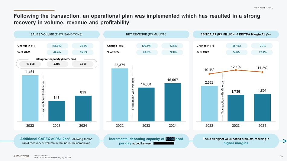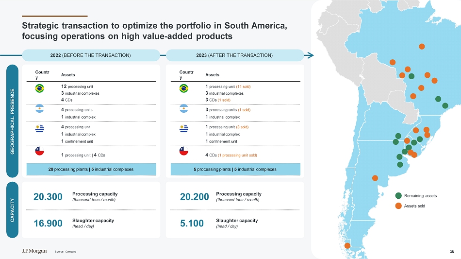 C O N F I D E N T I A L战略交易优化南美投资组合,专注于高附加值产品的运营地理存在能力资产Countr y 12个处理单元3个工业综合体4个CDS 4个处理单元1个工业综合体4个处理单元1个工业综合体1个约束单元1个处理单元| 4个CDS 20个加工厂| 5个工业综合体资产Countr y 1个处理单元(11个已售出)3个工业综合体3个CD(1个已售出)3个处理单元(1个已售出)1个工业综合体1个处理单元(3个已售出)1个工业综合体1个约束单元4个CD(1个已售出)5个加工厂| 5个工业综合体剩余资产已售2022(交易前)2023(交易后)处理能力(千吨/月)屠宰能力(头/天)20.300来源:公司3816.900处理能力(千吨/月)屠宰能力(头/天)20.2005.100