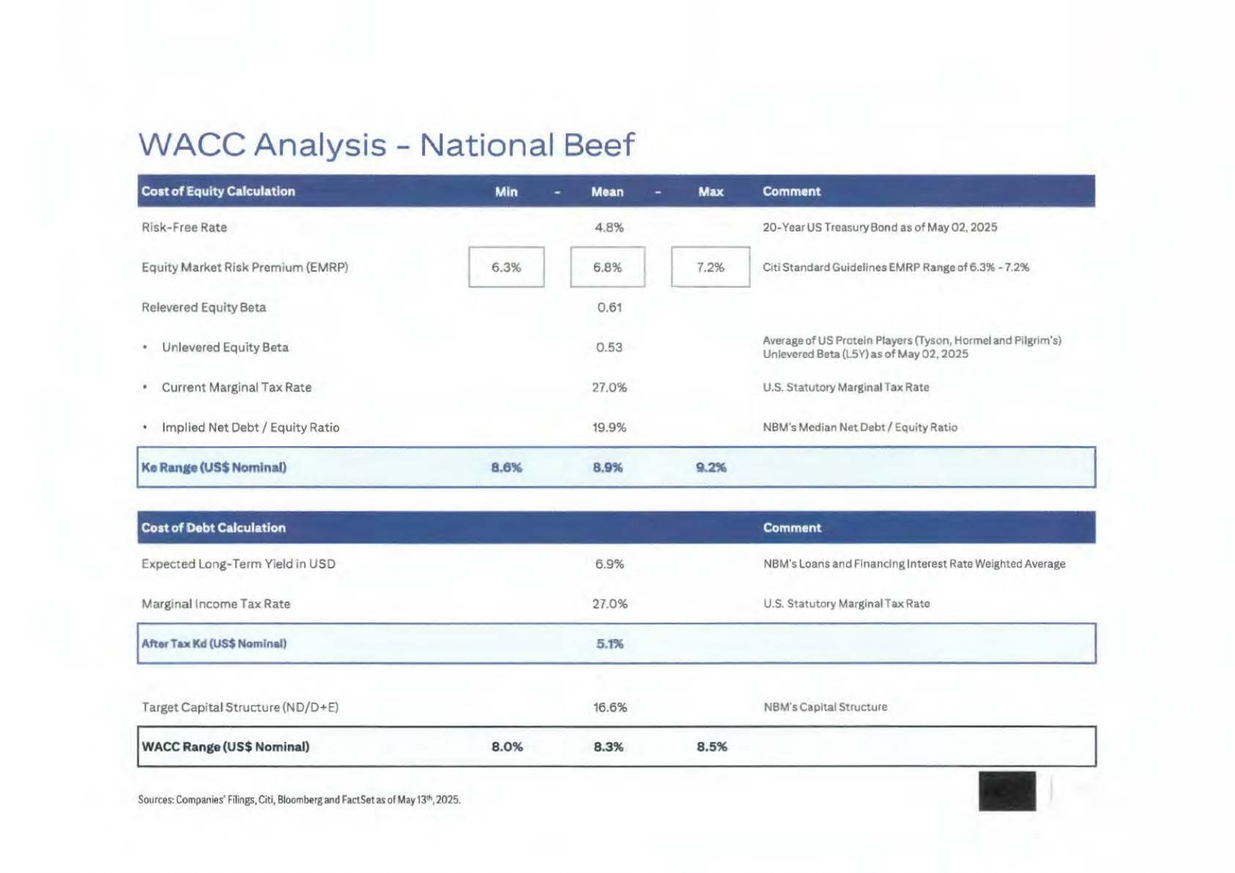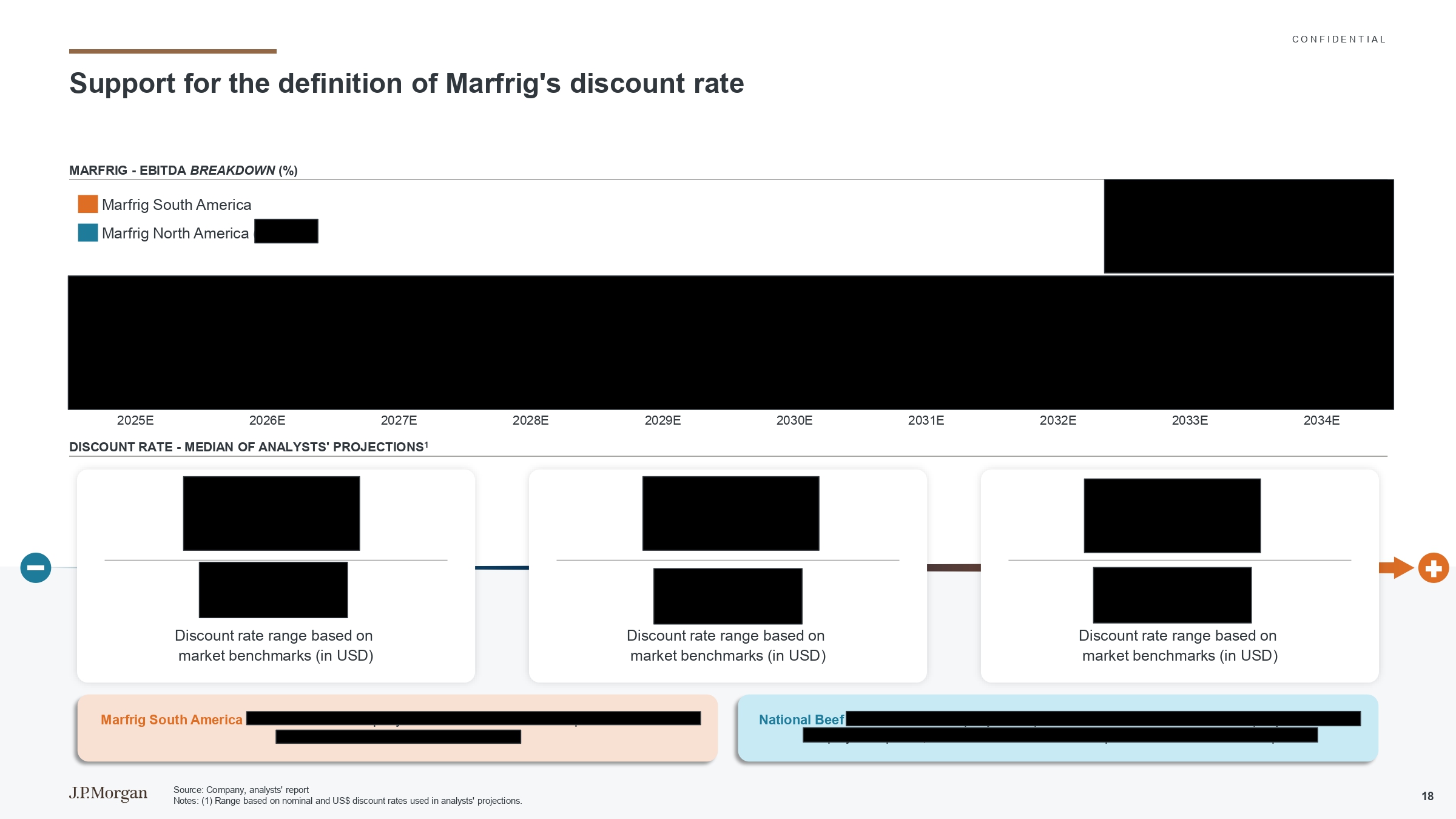 C O N F I D E N T I A L支持Marfrig贴现率的定义2025e 2026e 2027e贴现率-分析师预测的中位数1 2028e 2029e 2030e 2031e 2032e 2033e 2034e马弗里格-EBITDA细分(%)平均EBITDA细分S.A。:~40%平均EBITDA细分N.A。:~60% Marfrig南美Marfrig北美(@82%)29.7% 25.8% 26.7% 28.7% 30.8% 37.1% 43.9% 68.4% 69.7% 68.0% 70.3% 74.2% 73.3% 71.3% 69.2% 62.9% 56.1% 31.6% 30.3% 32.0%资料来源:公司、分析师报告基于市场基准的贴现率范围(美元)9%-10%基于市场基准的贴现率范围(美元)11%-12%基于市场基准的贴现率范围(美元)7.5%-8.5% 18 Marfrig南美是一家增值公司,其资本成本应该更接近于增值公司而不是大宗商品。National Beef是一家美国公司,在预计期间占合并后公司EBITDA的约60%,其资本成本应该更接近美国公司注:(1)区间基于分析师预测中使用的名义和美元贴现率。