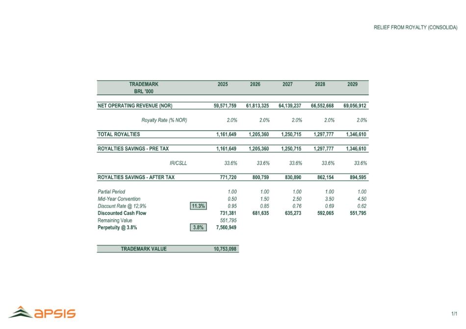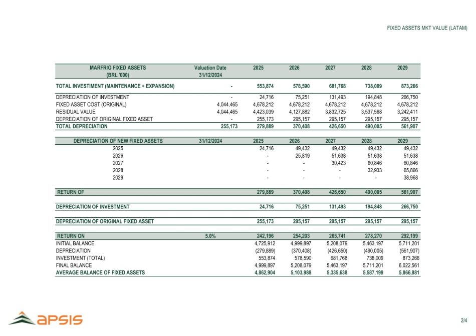 资本支出和营运资本预测Marfrig北美和南美C O N F I D E N T I A L主要假设Marfrig ex-BRF对于北美,它考虑的资本支出为2025年至2034年净营收的0.9%。对于南美,它认为资本支出在2025年占净收入的2.2%,在2026年占净收入的2.0%,从2027年开始正常化为1.9%。对于营运资金,估计考虑了2024年实现的营运资金天数的价值,预测不变,直到2034年资本支出和占总净收入的百分比(R $ MI,%)5216297167387587918018649279891,0461,1001,1799715135435705956376827297758241,7001,6001,1504341,2511,3001,3611,3961,5011,6091,7181,8211,9242.3% 1.9% 1.2% 1.2% 1.2% 1.2% 1.2% 1.2% 1.2% 2023A 2024A 2025E 2030E 2026E 2026E 2027E 2028E 2029E北美南美2031E 2032E 2033E 2034E收入占营运资本(MI雷亚尔)1,2941,4171,4621,5881,6651,8421,9872,1332,2772,340 2025E 2027E 2028E 2029E 2031