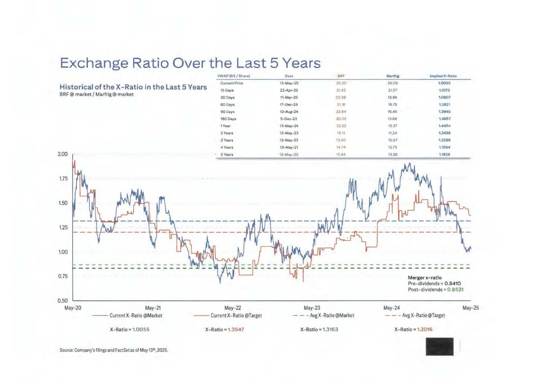 | (一) | 批准公司与Marfrig Global Foods SA(“MGF”)于2025年5月15日订立的“将BRF S.A.的股份合并为Marfrig Global Foods S.A.的合并计划”,经两家公司于2025年5月26日订立的“将BRF S.A.的股份合并为Marfrig Global Foods S.A.的合并计划第一修正案”(“合并计划”)修订和重述,其中确立了MGF(MGF持有的股份除外)将BRF发行的所有股份纳入公司的条款和条件,根据巴西第6,404/1976号联邦法(“巴西公司法”)第252条的规定(“合并”); |
