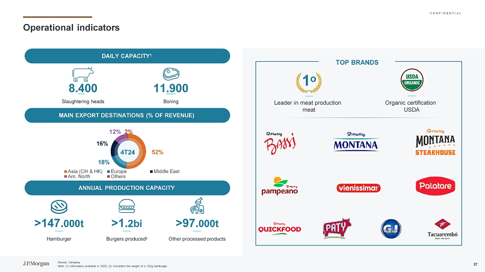 C O N F I D E N T I A L公司概况C O N F I D E N T I A L乌拉圭Fico专注于汉堡生产阿根廷1个工业综合体3个加工单元商业办公室巴西3个工业综合体1个加工厂3个配送中心商业办公室1个工业综合体1个加工厂1个饲养场商业办公室智利4个配送中心商业办公室CEO Rui Mendon ç a 40多年经验CFO Tang David 25多年经验161亿雷亚尔净收入202418亿雷亚尔EBITDA 202411.2% EBITDA利润率202481.5万吨销量16,236员工资料来源:公司36