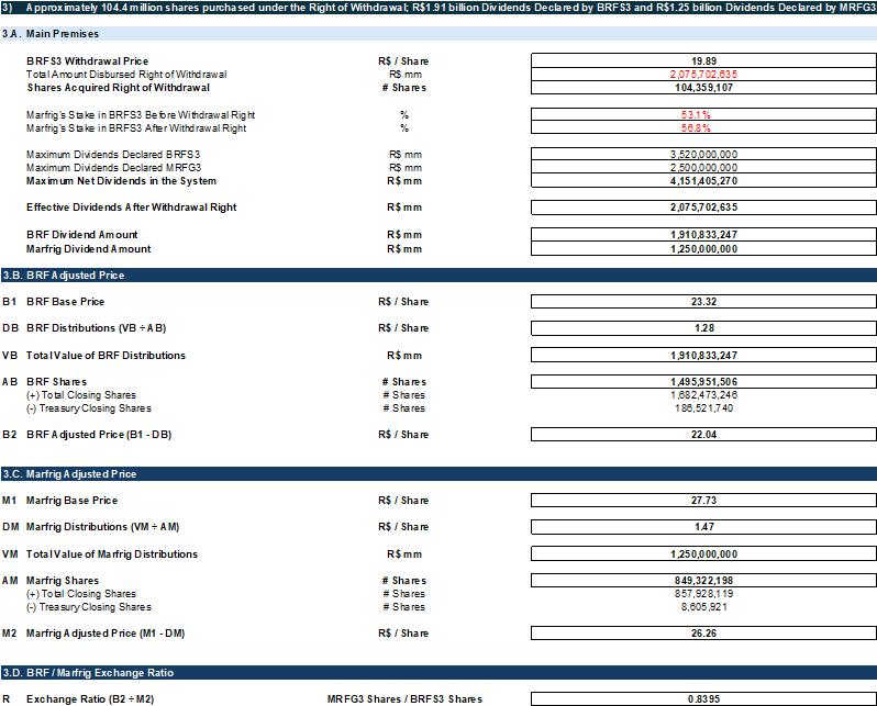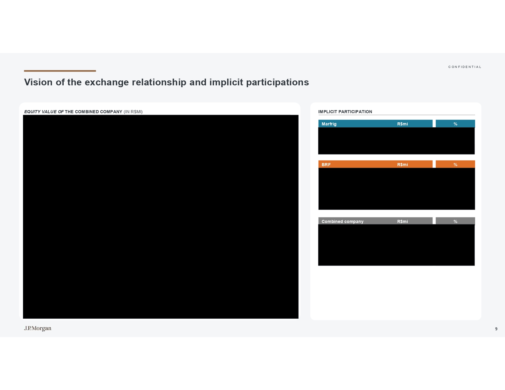 C O N F I D E N T I A L愿景交换关系和隐性参与合并公司股权价值(单位:R $ MI)隐性参与% R $ mi Marfrig 72.7% 18,823 MMS 27.3% 7,067其他股东100.0% 25,890合计% R $ mi BRF 53.1% 17,923 Marfrig 11.6% 3,915 SALIC 6.5% 2,180 Previ 28.8% 9,734其他股东100.0% 33,752合计% R $ mi合并公司45.1% 18,823 MMS 9.4% 3,915 SALIC 5.2% 2,180 Previ 40.3% 16,802其他股东100.0% 41,719合计25,89025,89015,82915,82941,719股权Vaulue Marfrig(+)股权价值少数股权TERM0股息)28,390(2,500)25,890850 R $ 30.44当量。价值(-)支付的股息等值。值AJ。股数每股价格隐含价格:33.38雷亚尔隐含价格:23.3037,272雷亚尔EQ。价值(3,520)(-)股息33,752 EQ。值AJ。46.9%少数股权15,829 EQ。价值最小值。750号股份Min。21.10雷亚尔每股价格9