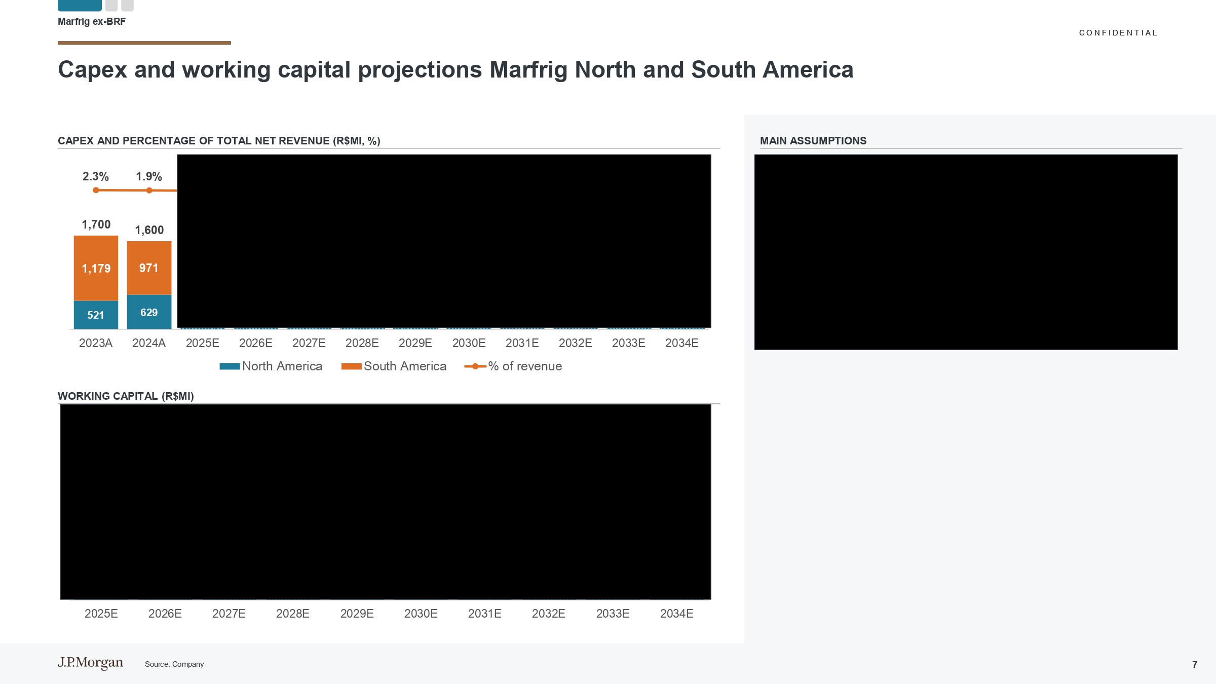 C O N F I D E N T I A L毛利润和毛利率(R $ MI,%)主要假设4,9254,7534,9205,1925,5485,8296,1336,5546,83119.3% 18.4% 19.3% 19.0% 17.0% 16.7% 16.6% 16.6% 16.3% 16.1% 16.1% 15.7% Marfrig South America Projections(Cont.)Marfrig ex-BRF 3,8632,9662,7612034E 2033E 2032E 2031E 2030E 2029E 2028E 2027E 2026E 2025E 20242023预计SG & A的毛利率将小幅下降,效率略有提高,导致EBITDA利润率与历史一致南美不像美国有同样的周期性行为,因为供需波动没有那么大。最重要的是,与美国相比,成本压力受大宗商品价格的影响较小,因为南美的牲畜养殖大多是粗放型的。此外,多年来,保证牛供应增加的部门仍在进行现代化改造。巴西牛质量的提高和卫生控制,特别是寄生虫和一般疾病的控制,缩小了巴西肉类与更高质量市场之间的价格差距巴西牲畜处于相当于美国生产力的15-20 %的生产力水平,表明该部门仍有投资空间和效率进步EBITDA和利润率(MI雷亚尔,%)SG & A占收入百分比(%)9.0% 3,913 2034E 6.7% 9.4% 3,823 2033E 6.7% 9.2% 3,524 2032E 6.8% 9.5% 3,388 2031E 6.8% 9.8% 3,264 2030E 6.8% 9.5% 2,965 2029E 7.1% 9.4% 2,775 2028E 7.3% 9.4% 2,619 2027E 7.6% 10.1% 2,613 2026E 8.9% 10.5% 2,107 2025E 8.8% 11.2% 1,80120247.2% 12.1% 1,73620237.2%资料来源:公司6