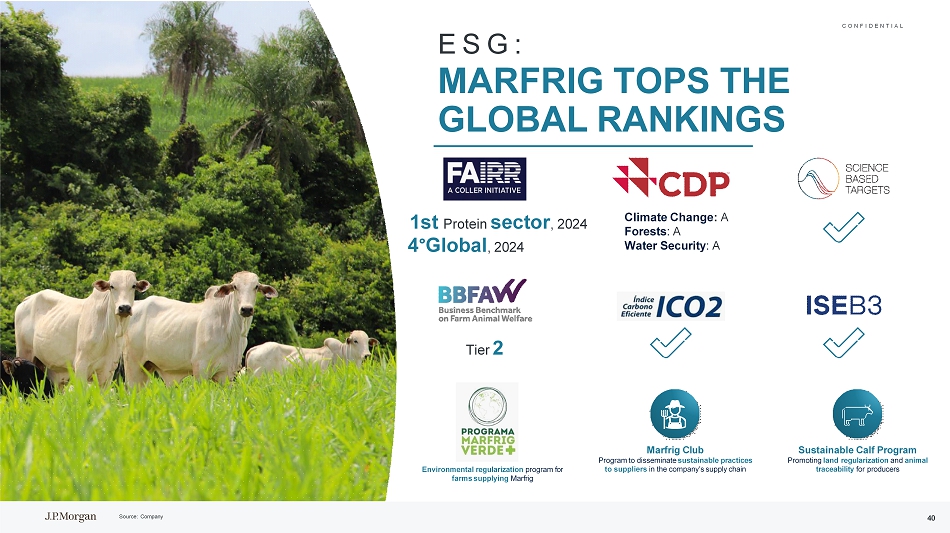 C O N F I D E N T I A L供应Marfrig Marfrig的农场的环境正规化计划俱乐部计划向公司供应链中的供应商传播可持续做法可持续小牛计划促进生产者的土地正规化和动物可追溯性第一蛋白质部门,2024 4 ④全球,2024 Tier 2气候变化:A Forests:A Water Security:A E S G:MARFRIG全球排名第一来源:公司40