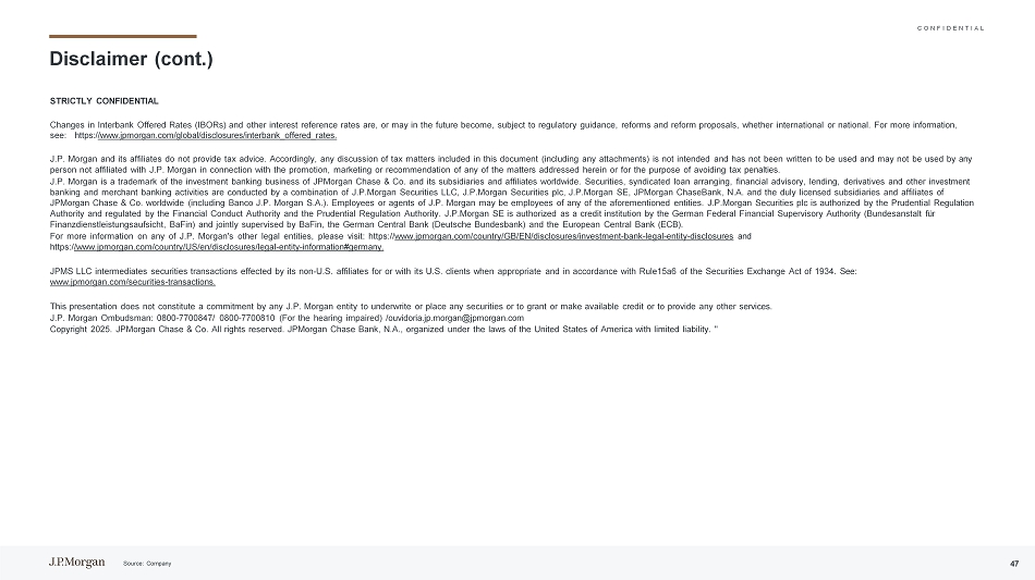 C O N F I D E N T I A L资料来源:公司47免责声明(续)银行间同业拆借利率(IBOR)和其他利率参考利率的严格保密变化正在或可能在未来成为受监管指导、改革和改革建议的约束,无论是国际的还是国家的。更多信息见:https://www.jpmorgan.com/global/disclosures/interbank _ offered _ rates。摩根大通及其关联公司不提供税务建议。因此,本文件(包括任何附件)中所包含的任何关于税务事项的讨论并非旨在也没有被书面使用,并且不得被与摩根大通无关的任何人用于与本文所述任何事项的推广、营销或推荐有关或用于避免税务处罚的目的。J.P. Morgan是摩根大通公司及其在全球的子公司和关联公司投资银行业务的商标。证券、银团贷款安排、财务顾问、借贷、衍生品和其他投资银行业务和商业银行业务活动由J.P.Morgan Securities LLC、J.P.Morgan Securities plc、J.P.Morgan SE、JPMorgan ChaseBank,N.A.以及摩根大通 & Co. worldwide(包括Banco J.P. Morgan S.A.)的正式许可的子公司和关联公司进行。摩根大通的雇员或代理人可能是上述任何实体的雇员。摩根大通证券有限公司由审慎监管局授权,受金融行为监管局和审慎监管局监管。J.P.Morgan SE由德国联邦金融监管局(Bundesanstalt f ü r Finanzdienstleistungsaufsicht,BaFin)授权为信贷机构,由BaFin、德国中央银行(Deutsche Bundesbank)和欧洲中央银行(ECB)共同监管。欲了解有关摩根大通其他任何法律实体的更多信息,请访问:https://www.jpmorgan.com/country/gn/en/disclosures/investment-bank-legal-entity-disclosures和https://www.jpmorgan.com/country/us/en/disclosures/legal-entity-information #德国。JPMS LLC在适当时根据1934年《证券交易法》第15a6条规则,为其非美国关联公司为其美国客户或与其美国客户进行的证券交易提供中介服务。见:www.jpmorgan.com/securities-transactions。本演示文稿不构成任何摩根大通实体承销或配售任何证券或授予或提供信贷或提供任何其他服务的承诺。摩根大通申诉专员:0800-7700847/0800-7700810(听障人士)/ouvidoria.jp.morgan@jpmorgan.com版权所有2025。摩根大通 & Co.版权所有。摩根大通银行,N.A.,根据美利坚合众国法律组建的有限责任公司。"