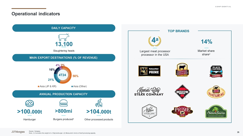C O N F I D E N T I A L营运指标52% 16% 12% 2%中东18%亚洲(CH & HK)Am。北欧其他4T24 8。400头屠宰日产能1 > 1。2bi Burgers生产2 > 97。000t其他加工产品> 147。000t汉堡包年度生产能力顶级品牌1 o肉类生产领导者有机认证肉类USDA11.9 00博宁主要出口目的地(占收入百分比)资料来源:公司注:(1)2025年可获得的信息;(2)考虑120克汉堡包的重量。37