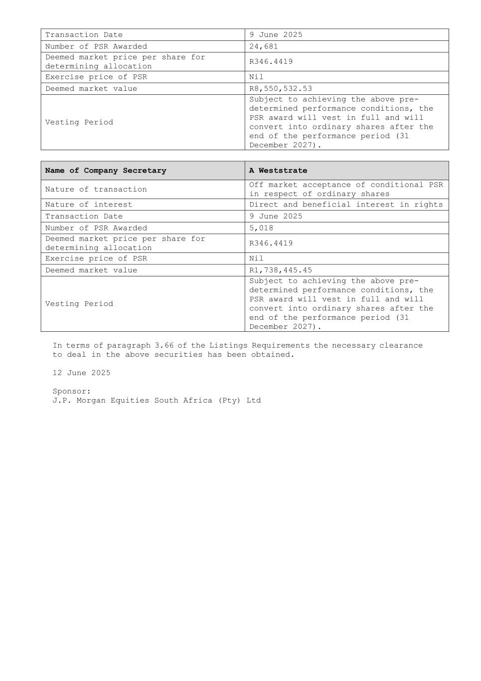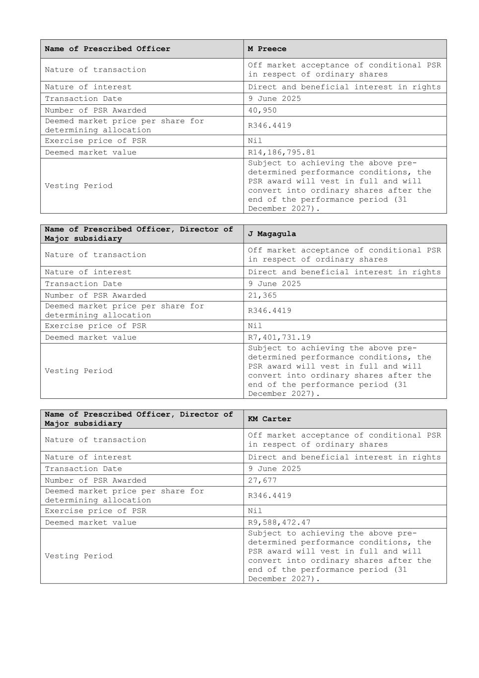 指定管理人员姓名M Preece交易性质场外接受有条件的PSR有关普通股权益性质的直接和实益权益权利交易日期2025年6月9日授予的PSR数量40,950确定分配R346.4419行使价的视为每股市场价格PSR Nil认为市值R14,186,795.81 授予期在实现上述预定业绩条件的前提下,PSR奖励将全部归属,并将在履约期结束后(2027年12月31日)转换为普通股。规定人员姓名、主要附属公司董事J Magagula交易性质场外接受有关普通股权益性质的有条件PSR直接权益和实益权益权利交易日期2025年6月9日授予的PSR数量21,365确定分配R346.4419行使价R346.4419 Nil认为市值R7,401,731.19 授予期在达到上述预定业绩条件的情况下,PSR奖励将全部归属,并将在履约期结束后(2027年12月31日)转换为普通股。主要子公司KM Carter的指定管理人员、董事的姓名交易性质场外接受有条件的PSR的普通股权益性质直接权益和实益权益权利交易日期2025年6月9日授予的PSR数量27,677确定分配R346.4419行使价R346.4419 Nil认为市值R9,588,472.47 授予期在达到上述预定业绩条件的情况下,PSR奖励将全部归属,并将在履约期结束后(2027年12月31日)转换为普通股。