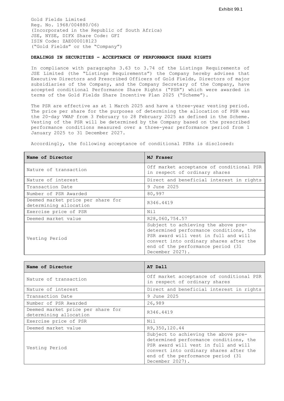 Gold Fields Limited Reg. No. 1968/004880/06)(于南非共和国注册成立)JSE,NYSE,DIFX股份代码:GFI ISIN代码:ZAE000018123(“金田”或“公司”)从事证券交易–根据JSE Limited的上市要求(“上市要求”)第3.63至3.74段接受业绩股份权利公司特此告知,执行董事及金田的规定高级人员、公司主要附属公司的董事、公司的公司秘书,已接受根据《金田股份激励计划2025》(“计划”)授予的有条件业绩份额权利(“PSR”)。该PSR自2025年3月1日起生效,归属期为三年。为厘定分配PSR而厘定的每股价格为该计划所定义的2025年2月3日至2月28日的20天VWAP。该PSR的归属由公司根据自2025年1月1日至2027年12月31日三年业绩期间计量的规定业绩条件确定。据此,披露以下对有条件PSR的接受情况:董事姓名MJ Fraser交易性质场外接受关于普通股权益性质的有条件PSR权利交易的直接和实益权益交易日2025年6月9日授予的PSR数量80,997确定分配R346.4419行使价R346.4419 Nil认为市值R28,060,754.57 授予期的视为每股市场价格在实现上述预定业绩条件的情况下,PSR奖励将全额归属,并将在履约期结束后(2027年12月31日)转换为普通股。AT Dall董事姓名场外交易性质就普通股的权益性质接受有条件的PSR直接和实益权益的权利交易日期2025年6月9日授予的PSR数量26,989确定分配R346.4419行使价的视为每股市场价格PSR Nil认为市值R9,350,120.44 授予期在实现上述预定业绩条件的前提下,PSR奖励将全部归属,并将在业绩期结束后(2027年12月31日)转换为普通股。