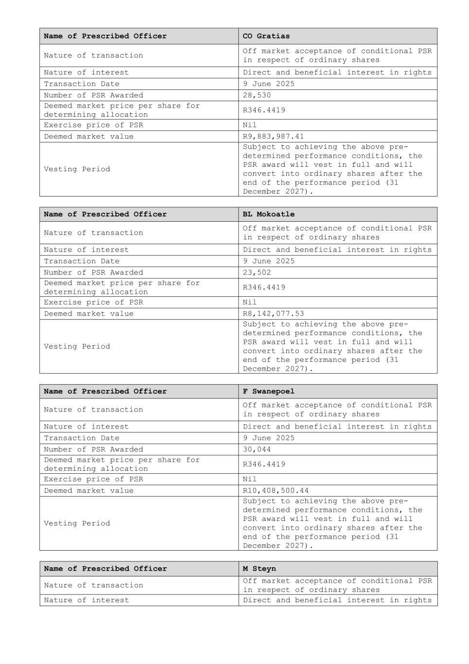 指定人员名称CO Gratias交易性质场外接受有条件的PSR有关普通股权益性质的直接和实益权益权利交易日期2025年6月9日授予的PSR数量28,530确定分配R346.4419行使价的视为每股市场价格PSR Nil认为市值R9,883,987.41 授予期在实现上述预定业绩条件的情况下,PSR奖励将全部归属,并将在业绩期结束后(2027年12月31日)转换为普通股。指定管理人员姓名BL Mokoatle交易性质场外接受有条件的PSR有关普通股权益性质直接权益和实益权益交易日期2025年6月9日用于确定分配R346.4419行使价的PSR限制性股票数量23,502视为每股市场价格Nil视为市值R8,142,077.53 授予期在实现上述预定业绩条件的前提下,TERM4奖励将全部归属,并将在业绩期结束后(2027年12月31日)转换为普通股。指定官员姓名F Swanepoel交易性质场外接受有关普通股权益性质的有条件PSR直接和实益权益权利交易日期2025年6月9日授予的PSR数量30,044确定分配R346.4419行使价的视为每股市场价格PSR Nil认为市值R10,408,500.44 授予期在达到上述预定业绩条件的情况下,PSR奖励将全部归属,并将在业绩期结束后(2027年12月31日)转换为普通股。处方人员姓名M Steyn交易性质场外接受关于普通股的有条件PSR权益性质权利的直接和实益权益
