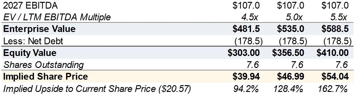如果董事会遵循我们的资本配置建议,我们认为到2027年底,该股票的保守价值可能在每股40美元至54美元之间,在这个估值区间的中点有近130%的上涨空间:9