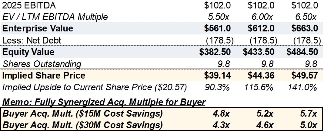 根据可比交易倍数,我们认为Civeo的出售价格可能在每股39美元至50美元之间,较该区间中点的当前交易价格溢价近116%。假设战略收购方可以削减3000万美元的间接费用,这个价格将代表4.6倍EBITDA的完全协同倍数。