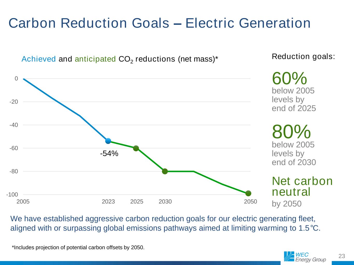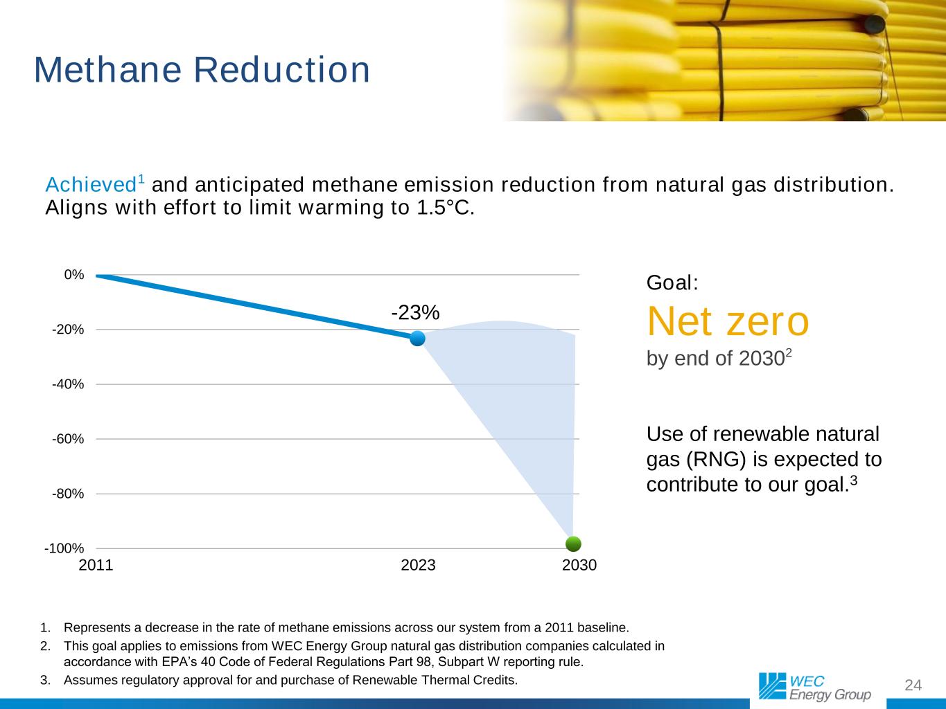 24-100 %-80 %-60 %-40 %-20 %0% 201120232030实现1和预期的天然气分配甲烷排放量减少。与将升温限制在1.5 ° C的努力保持一致。-23 %目标:到20302年底实现净零使用可再生天然气(RNG)预计将为我们的目标做出贡献。3甲烷减排1。表示我们整个系统的甲烷排放速度比2011年的基线有所下降。2.这一目标适用于根据EPA的40 Code of Federal Regulations Part 98,SubPart W报告规则计算的WEC能源集团天然气分销公司的排放量。3.承担可再生热信贷的监管批准和购买。