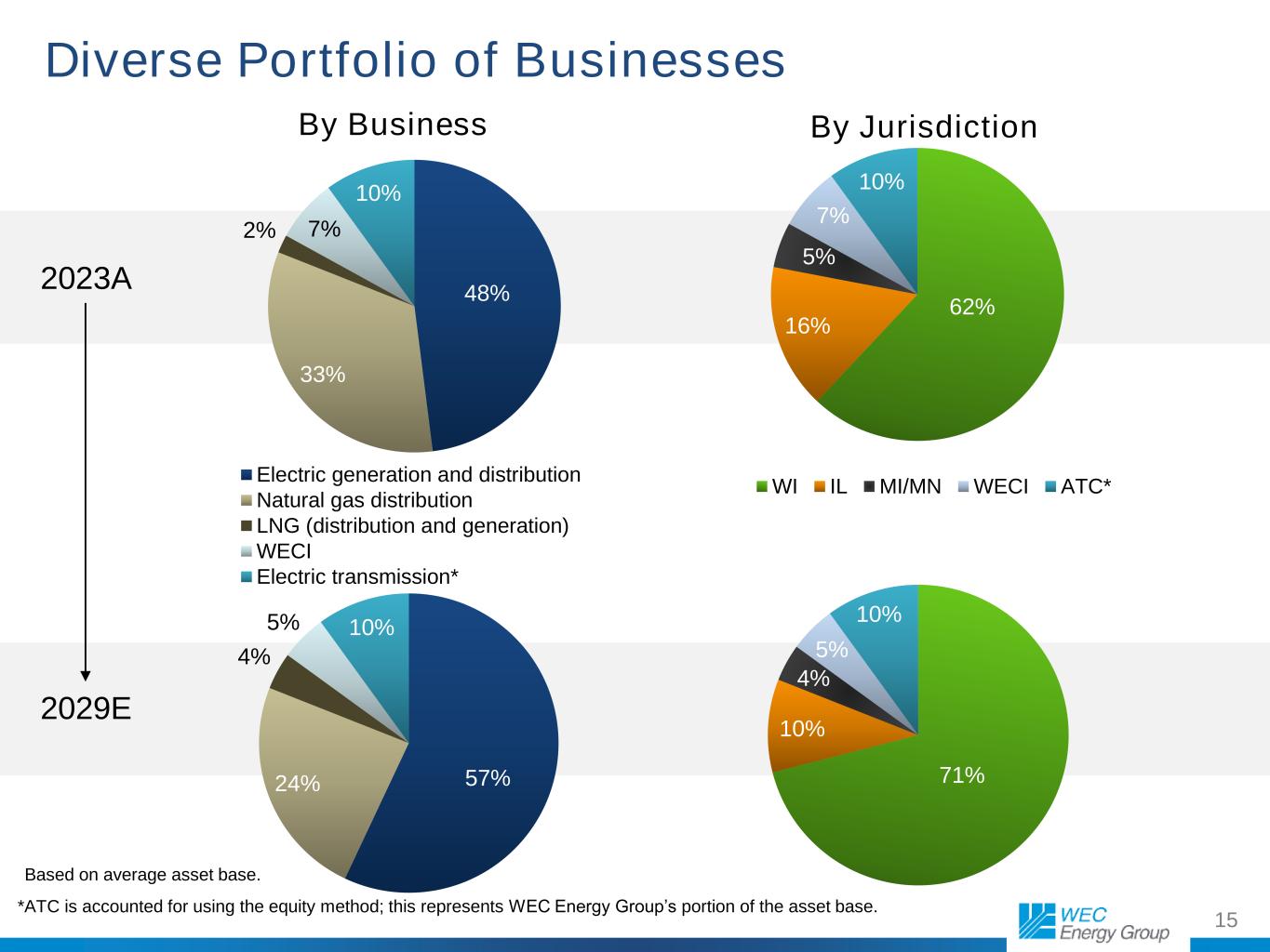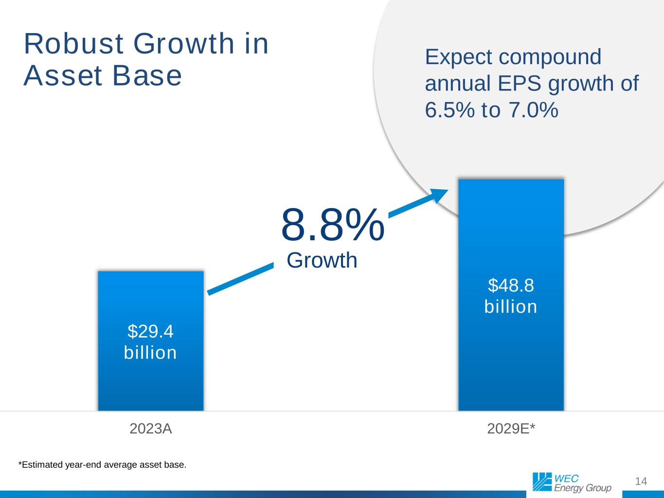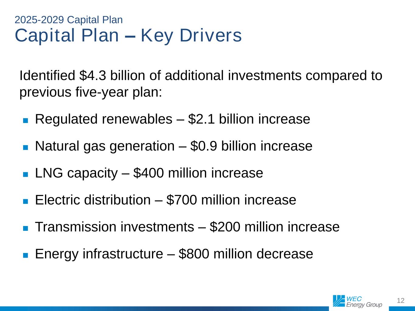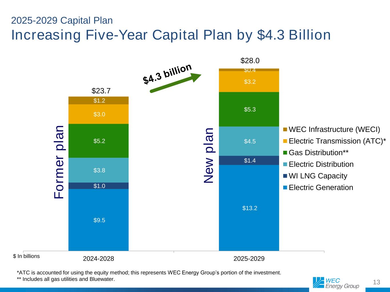 13 $ 9.5 $ 13.2 $ 1.0 $ 1.4 $ 3.8 $ 4.5 $ 5.2 $ 5.3 $ 3.0 $ 3.2 $ 1.2 $ 0.4 $ 23.7 $ 28.0 2024-2028 2025-2029 WEC基础设施(WEC)电力传输(ATC)*气体分配**配电WI LNG容量发电N e w p la n f o rm e r p la n十亿美元*ATC采用权益法核算;这代表WEC能源集团的投资部分。**包括所有燃气公用事业和Bluewater。2025-2029年资本计划增加五年资本计划43亿美元