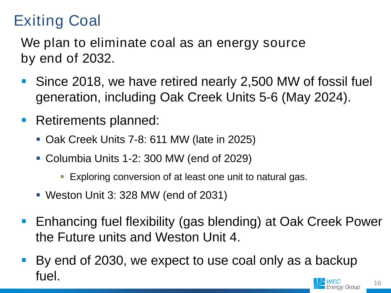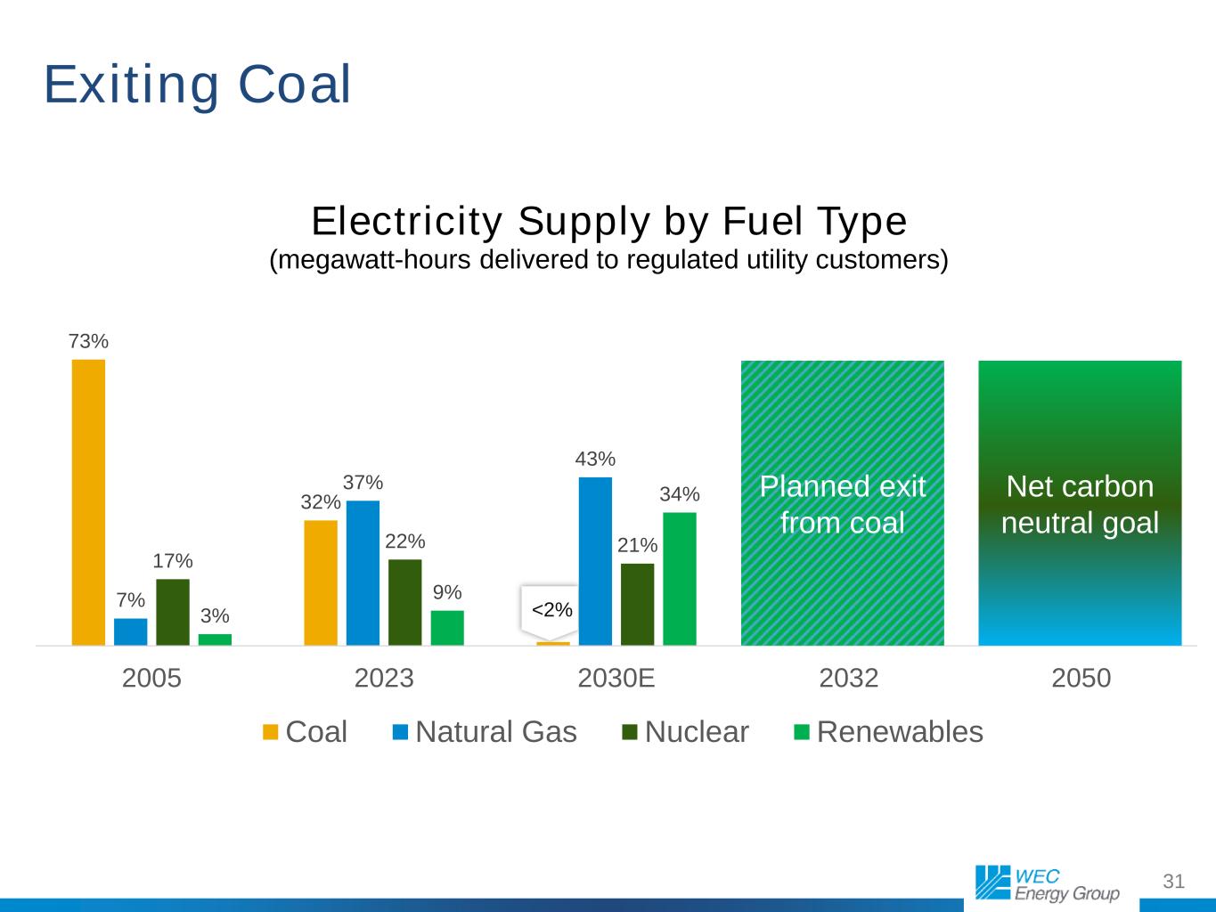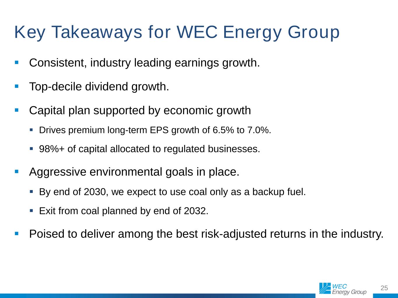 25一致,行业领先的盈利增长。股息增长前十名。经济增长支持的资本计划推动溢价长期每股收益增长6.5%至7.0%。98% +的资本分配给受监管的业务。积极的环境目标到位。到2030年底,我们预计将仅使用煤炭作为备用燃料。计划在2032年底前退出煤炭。准备交付业内最好的风险调整后回报。WEC能源集团关键要点