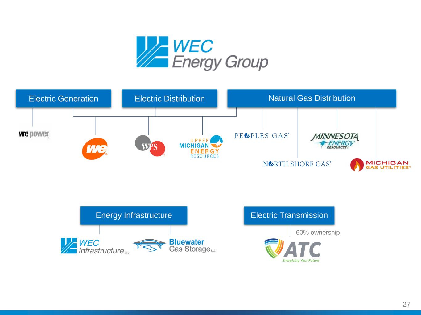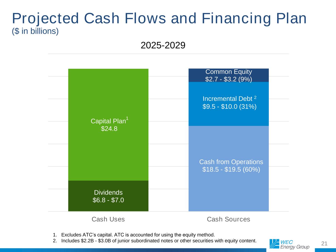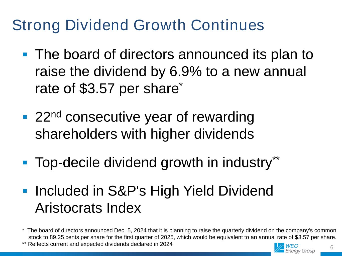 25一致,行业领先的盈利增长。股息增长前十名。经济增长支持的资本计划推动溢价长期每股收益增长6.5%至7.0%。98% +的资本分配给受监管的业务。积极的环境目标到位。到2030年底,我们预计将仅使用煤炭作为备用燃料。计划在2032年底前退出煤炭。准备交付业内最好的风险调整后回报。WEC能源集团关键要点