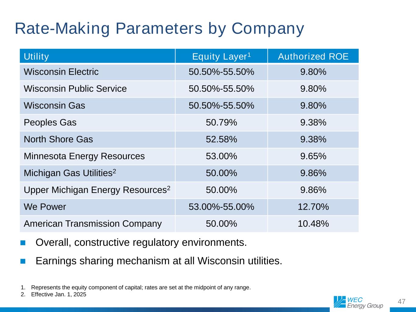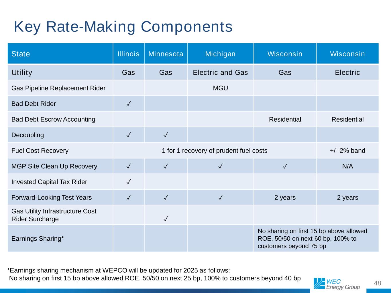 47个按公司公用事业股权层划分的费率制定参数1授权ROE Wisconsin Electric 50.50%-55.50 % 9.80% Wisconsin Public Service 50.50%-55.50 % 9.80% Wisconsin Gas 50.50%-55.50 % 9.80% Peoples Gas 50.79% 9.38% North Shore Gas 52.58% 9.38% Minnesota Energy Resources 53.00% 9.65% Michigan Gas Utilities2 50.00% 9.86% Upper Michigan Energy Resources2 50.00% 9.86% We Power 53.00%-55.00 % 12.70% American Transmission Company 50.00% 10.48% 1。表示资本的权益部分;费率设定在任何范围的中点。2.2025年1月1日生效总体而言,建设性的监管环境。威斯康星州所有公用事业公司的收益分享机制。