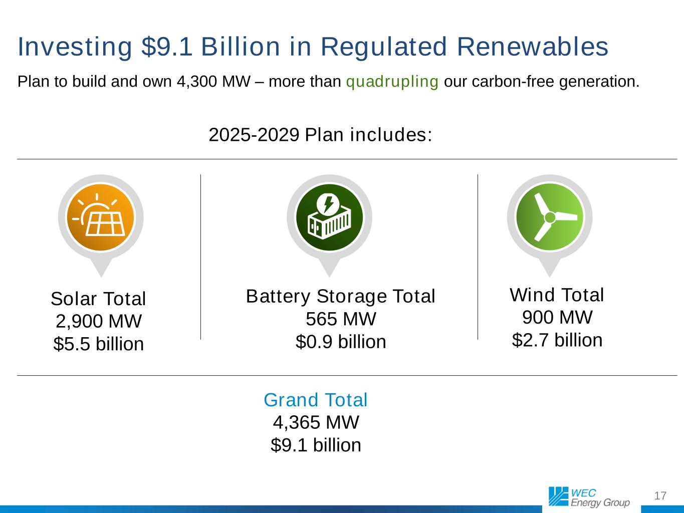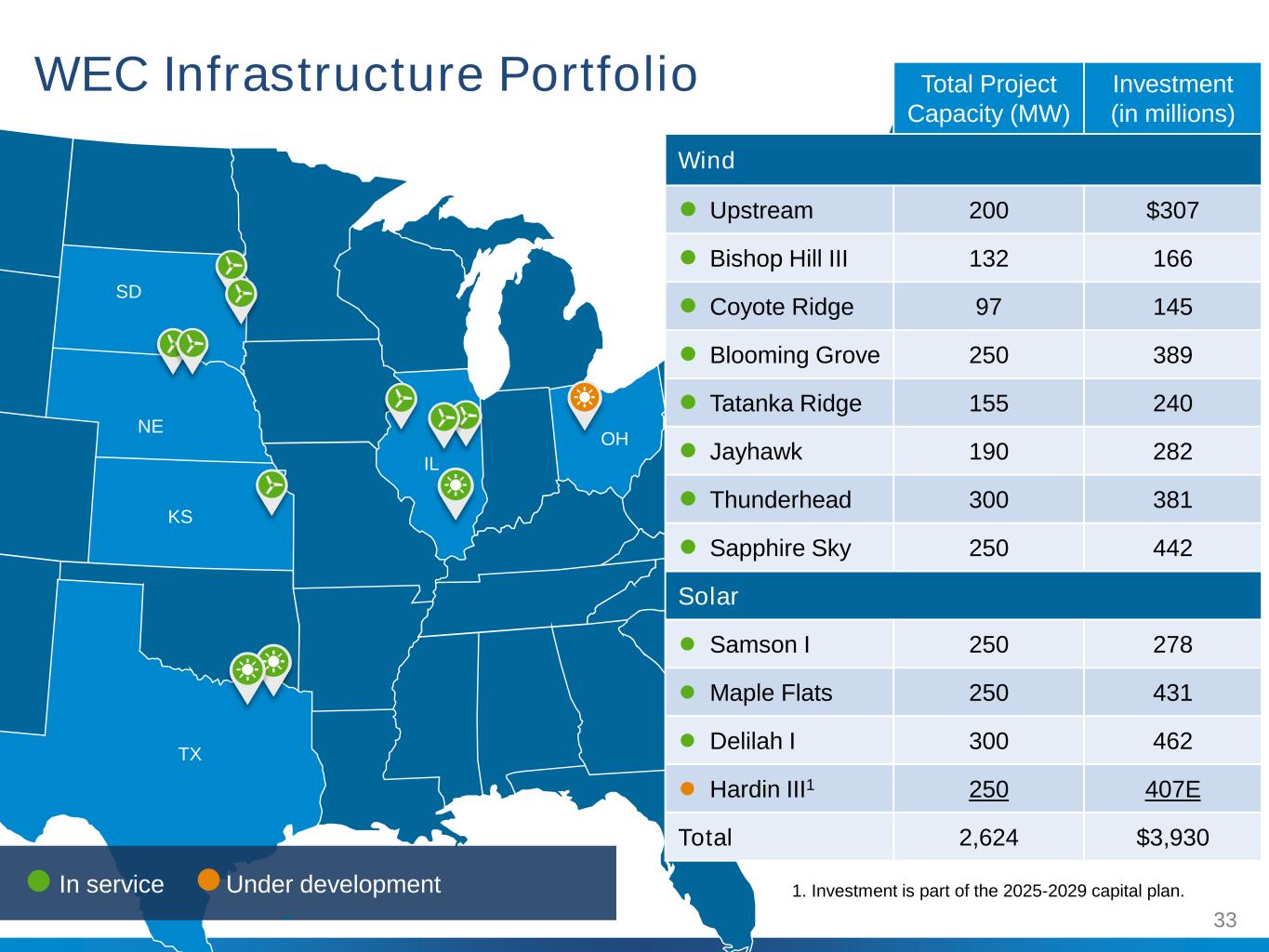 33项正在开发中的服务1。投资是2025-2029年资本计划的一部分。WEC基础设施投资组合项目总容量(MW)投资(百万)Wind ●上游200 $ 307 ● Bishop Hill III 132166 ● Coyote Ridge 97 145 ● Blooming Grove 250389 ● Tatanka Ridge 155240 ● Jayhawk 190282 ● Thunderhead 300381 ● Sapphire Sky 250442 Solar ● Samson I 250278 ● Maple Flats 250431 ● Delilah I 300462 ● Hardin II1 250 407e total 2,624 $ 3,930 SD IL NE KS TX OH
