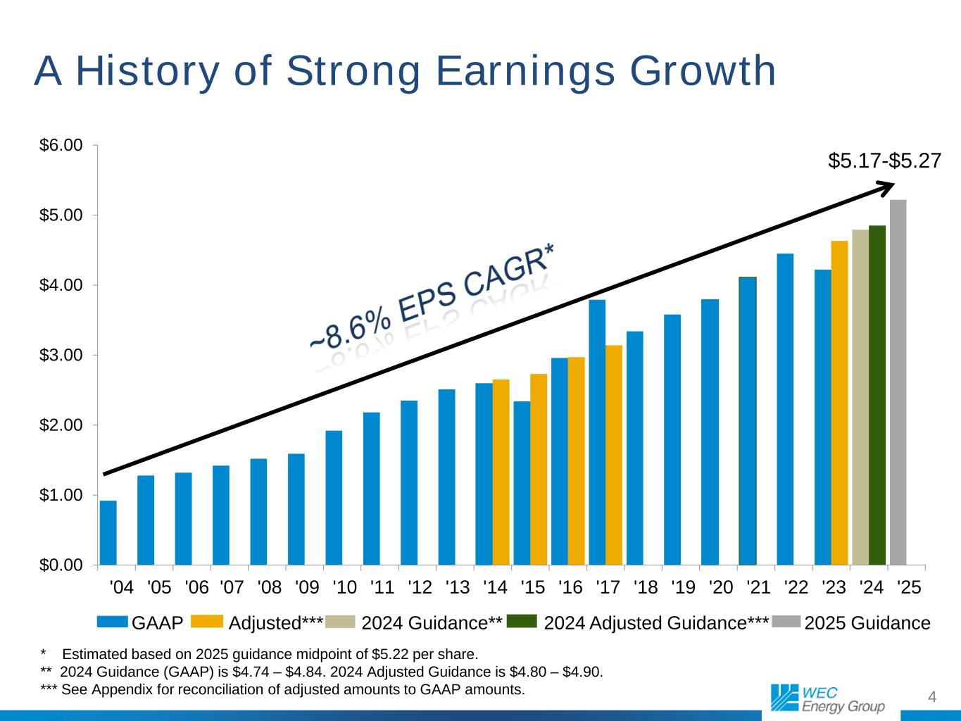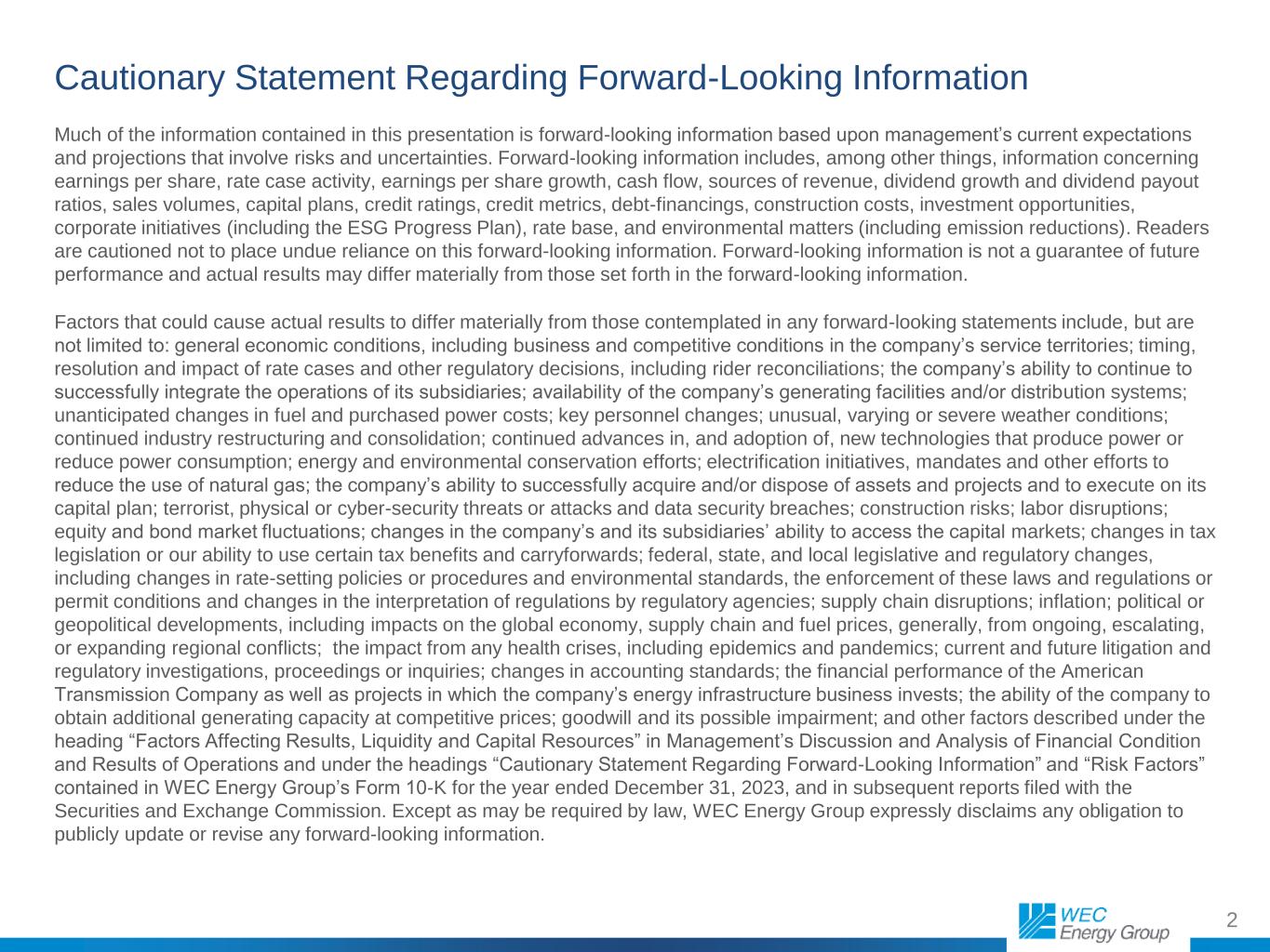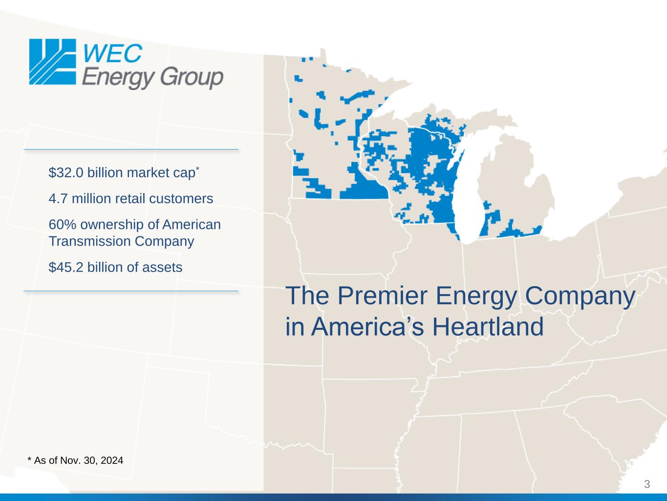 2关于前瞻性信息的警示性声明本演示文稿中包含的大部分信息是基于管理层当前预期和预测的前瞻性信息,其中涉及风险和不确定性。除其他外,前瞻性信息包括有关每股收益、费率案例活动、每股收益增长、现金流、收入来源、股息增长和派息率、销量、资本计划、信用评级、信用指标、债务融资、建设成本、投资机会、企业举措(包括ESG进展计划)、费率基数和环境事项(包括减排)的信息。提醒读者不要过分依赖这些前瞻性信息。前瞻性信息并非对未来业绩的保证,实际结果可能与前瞻性信息中所述的存在重大差异。可能导致实际结果与任何前瞻性陈述中设想的结果存在重大差异的因素包括但不限于:一般经济状况,包括公司服务领域的业务和竞争条件;费率案件和其他监管决定的时机、解决方案和影响,包括骑手和解;公司继续成功整合其子公司的运营的能力;公司发电设施和/或配电系统的可用性;燃料和购买电力成本的意外变化;关键人员变动;不寻常、变化或恶劣的天气条件;持续的行业重组和整合;持续推进,和采用、产生电力或减少电力消耗的新技术;能源和环境保护努力;电气化举措、授权和其他减少天然气使用的努力;公司成功获取和/或处置资产和项目以及执行其资本计划的能力;恐怖、物理或网络安全威胁或攻击以及数据安全漏洞;建设风险;劳动力中断;股票和债券市场波动;公司及其子公司进入资本市场的能力发生变化;税法或我们使用某些税收优惠和结转的能力发生变化;联邦、州,以及地方立法和监管变化,包括制定利率的政策或程序以及环境标准的变化、这些法律法规或许可条件的执行以及监管机构对法规解释的变化;供应链中断;通货膨胀;政治或地缘政治发展,包括持续、升级或扩大的区域冲突对全球经济、供应链和燃料价格的影响;任何健康危机的影响,包括流行病和大流行病;当前和未来的诉讼和监管调查,诉讼或问询;会计准则变更;美国输电公司的财务业绩以及公司能源基础设施业务所投资的项目;公司以具有竞争力的价格获得额外发电量的能力;商誉及其可能的减值;以及管理层对财务状况和经营业绩的讨论和分析中“影响业绩、流动性和资本资源的因素”标题下以及“关于前瞻性信息的警示性声明”和“风险因素”标题下描述的其他因素,这些因素载于截至2023年12月31日止年度的WEC能源集团 10-K表,以及随后提交给美国证券交易委员会的报告。除法律可能要求外,WEC能源集团明确表示不承担任何公开更新或修改任何前瞻性信息的义务。