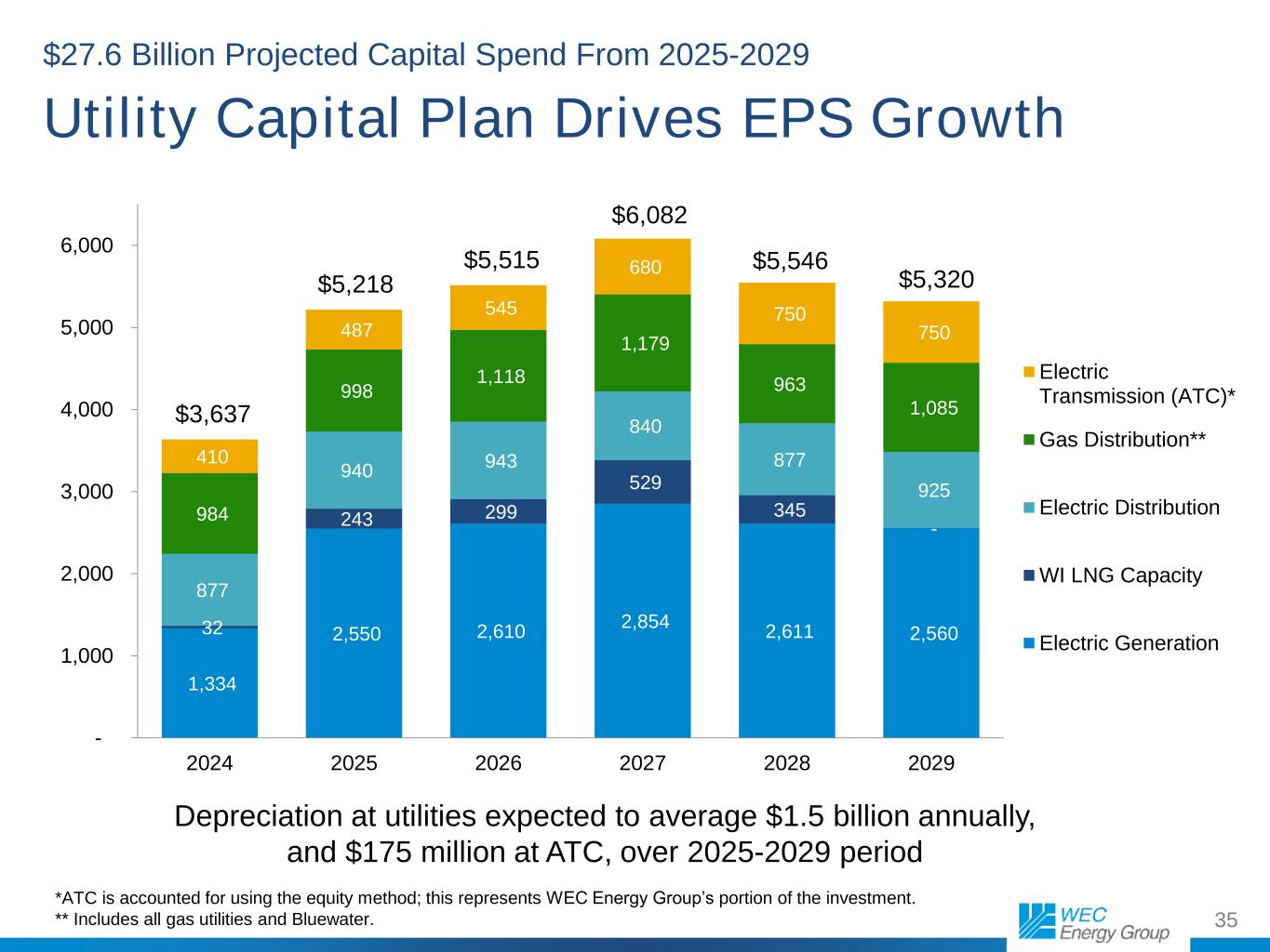 35公用事业资本计划推动每股收益增长276亿美元2025-2029年预计资本支出1,3342,5502,6102,8542,6112,56032243299529345-8779409438408779259849981,1181,1799631,085410487545680750750 $ 3,637 $ 5,218 $ 5,515 $ 6,082 $ 5,546 $ 5,320-1,0002,0003,0004,0005,0006,0006,0006,0006,0006,0006,0006,0006,0006,0006,0006,0006,0006,0006,0006,0006,0006,0006*气体分配**配电WI LNG容量公用事业公司的发电折旧预计平均每年为15亿美元,ATC为1.75亿美元,2025-2029年期间*ATC采用权益法核算;这代表WEC能源集团的投资部分。**包括所有燃气公用事业和Bluewater。