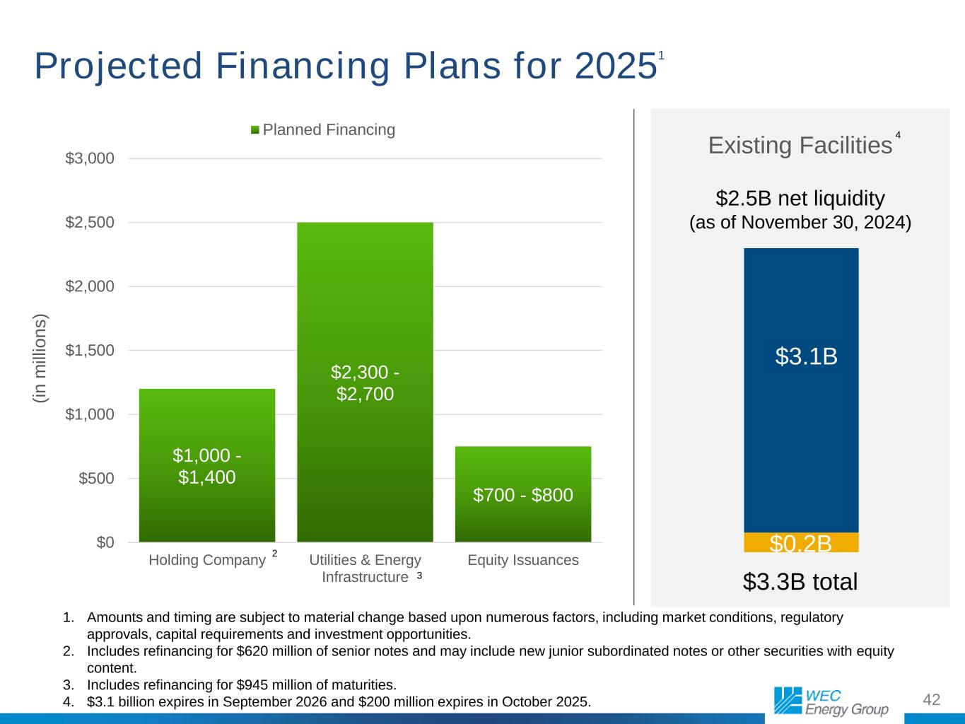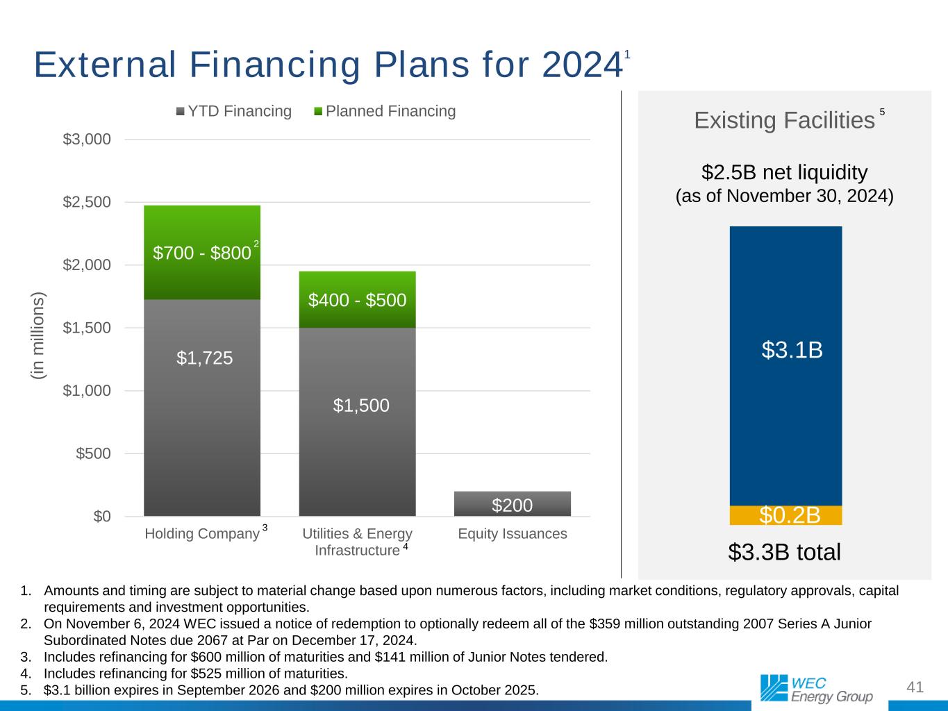 2024年41个外部融资计划1 $ 700-$ 800 $ 400-$ 500 $ 0 $ 500 $ 500 $ 1,000 $ 1,500 $ 1,500 $ 2,000 $ 2,500 $ 3,000控股公司公用事业和能源基础设施股票发行(i n m ill io n s)年初至今融资计划融资1,725231。金额和时间可能会根据多种因素发生重大变化,包括市场条件、监管批准、资本要求和投资机会。2.11月6日,2024年WEC发布赎回通知,可选择于2024年12月17日按面值赎回全部于2067年到期的3.59亿美元未偿还的2007年A系列初级次级票据。3.包括为6亿美元的到期日和1.41亿美元的初级票据进行再融资。4.包括5.25亿美元到期的再融资。5.31亿美元将于2026年9月到期,2亿美元将于2025年10月到期。4现有融资$ 2.5B净流动性(截至2024年11月30日)$ 3.1B $ 0.2B $ 3.3B总计5 $ 1,500 $ 200