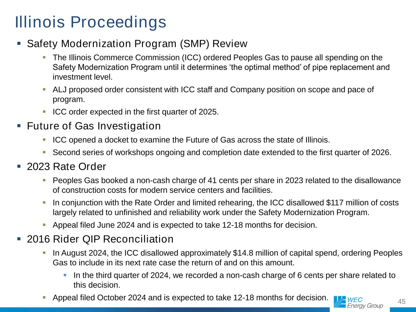 45 Illinois Proceedings Safety Modernization Program(SMP)Review伊利诺伊州商务委员会(ICC)下令Peoples Gas暂停安全现代化计划的所有支出,直到它确定管道更换和投资水平的‘最佳方法’。ALJ提议的订单与ICC工作人员和公司在项目范围和速度方面的立场一致。预计2025年第一季度ICC订单。天然气调查的未来ICC开设了一个案卷,审查伊利诺伊州天然气的未来。第二系列研讨会正在进行中,完成日期延长至2026年第一季度。2023年费率令Peoples Gas在2023年就现代服务中心和设施的建设成本不予考虑而记入每股41美分的非现金费用。与费率令和有限的重审相结合,国际刑事法院驳回了主要与安全现代化计划下未完成和可靠性工作相关的1.17亿美元费用。上诉于2024年6月提出,预计需要12-18个月才能做出决定。2016年Rider QIP和解2024年8月,ICC不允许大约1480万美元的资本支出,命令Peoples Gas在其下一个费率案例中包括这一金额的返还。在2024年第三季度,我们记录了与该决定相关的每股6美分的非现金费用。上诉于2024年10月提出,预计需要12-18个月才能做出决定。