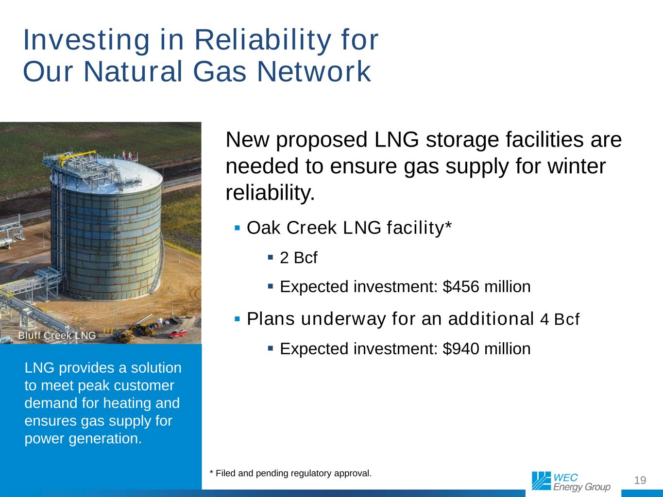 19投资于我们天然气网络的可靠性需要新提议的液化天然气储存设施,以确保冬季可靠性的天然气供应。Oak Creek液化天然气设施*2 BCF预期投资:4.56亿美元的计划正在进行中,额外的4 BCF预期投资:9.4亿美元的液化天然气提供了一种解决方案,以满足客户供暖高峰需求,并确保发电用气供应。*已备案并正在等待监管部门的批准。布拉夫溪液化天然气