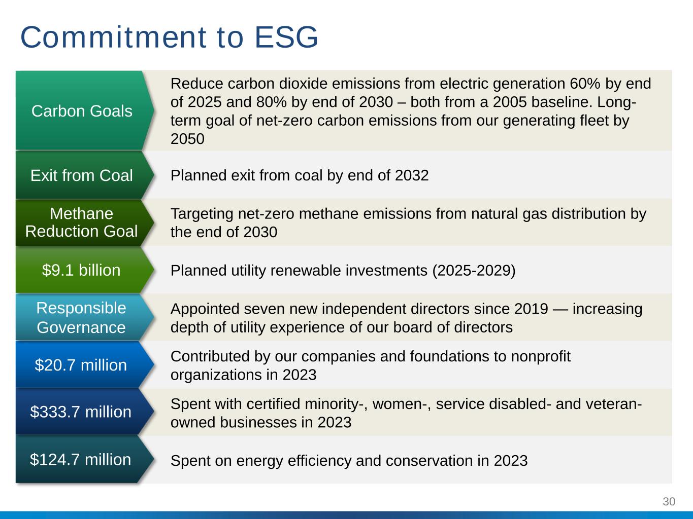 30到2025年底将发电产生的二氧化碳排放量减少60%,到2030年底减少80% ——两者均以2005年为基准。到2050年我们的发电车队实现净零碳排放的长期目标计划到2032年底退出煤炭,目标是到2030年底天然气分配产生的甲烷净零排放计划中的公用事业可再生投资(2025-2029年))自2019年以来任命了七位新的独立董事——增加了我们董事会的公用事业经验的深度,由我们的公司和基金会在2023年为非营利组织提供的经认证的少数群体-、女性-,2023年为残疾人和退伍军人拥有的企业提供服务2023年用于能源效率和节约的承诺ESG 1.247亿美元3.337亿美元2070万美元负责任的治理91亿美元甲烷减排目标退出煤炭碳目标