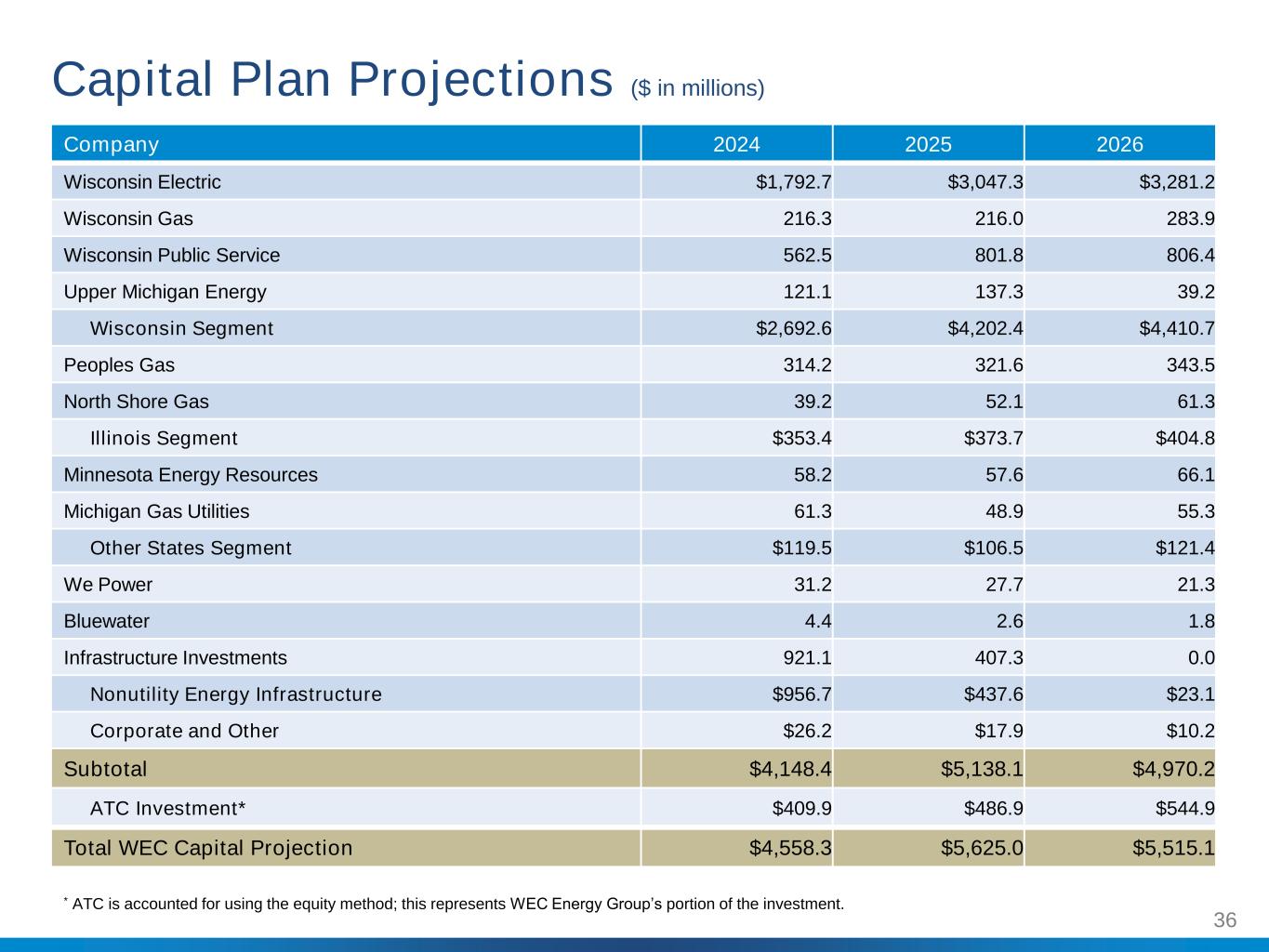 36公司202420252026 Wisconsin Electric $ 1,792.7 $ 3,047.3 $ 3,281.2 Wisconsin Gas 216.32 16.02 83.9 Wisconsin Public Service 56 2.5801.88 06.4 Upper Michigan Energy 121.11 37.339.2 Wisconsin Segment $ 2,69 2.6 $ 4,202.4 $ 4,410.7 Peoples Gas 314.23 21.63 43.5 North Shore Gas 39.25 2.16 1.3 Illinois Segment $ 353.4 $ 373.7 $ 404.8 Minnesota Energy Resources 58.257.666.1 Michigan Gas Utilities 61.348.955.3 Other States Segment $ 119.5 $ 106.5 $ 121.4 We Power 31.227.72 1.3 Bluewater 4.4和其他$ 26.2 $ 17.9 $ 10.2小计$ 4,148.4 $ 5,138.1 $ 4,970.2 ATC投资*409.9美元486.9美元544.9美元WEC资本预测总额4,558.3美元5,625.0美元5,515.1美元资本计划预测(百万美元)*ATC采用权益法核算;这代表WEC能源集团的投资部分。
