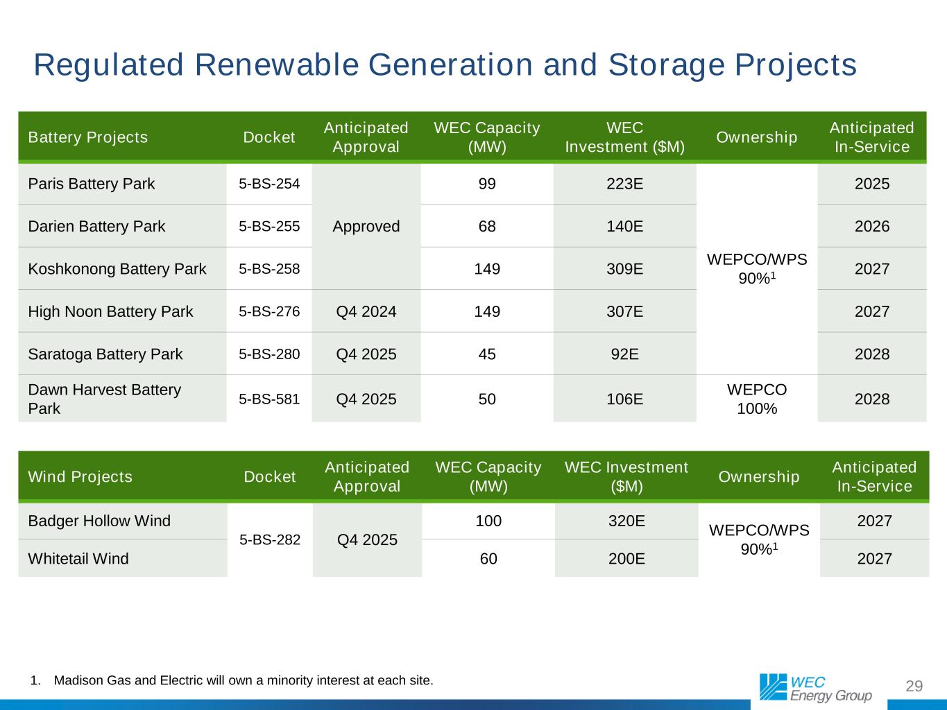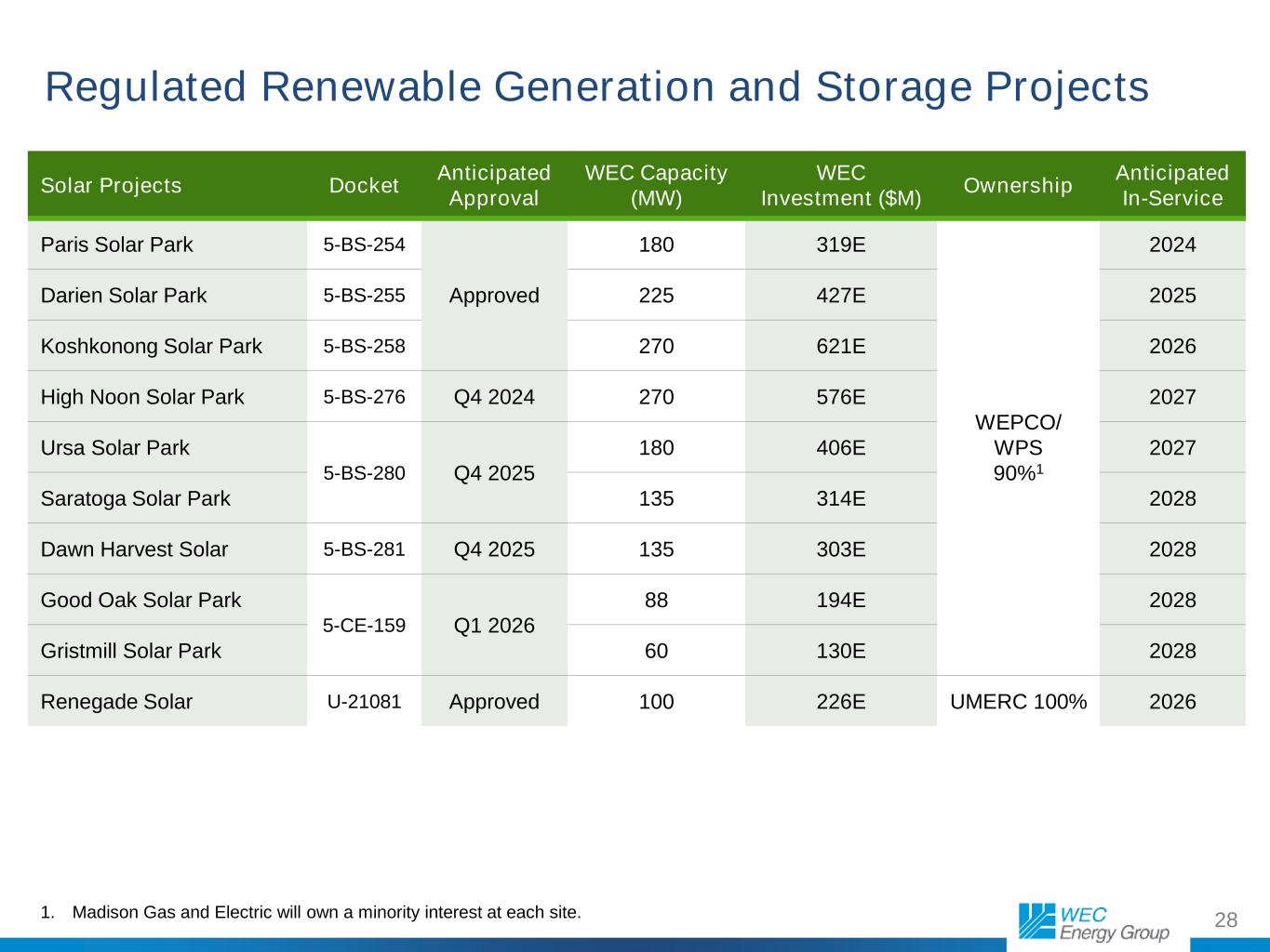 28个太阳能项目案卷预期批准WEC容量(MW)WEC投资($ M)所有权预期在役巴黎太阳能公园5-BS-254批准180 319e WEPCO/WPS 90% 12024 Darien Solar Park 5-BS-255225 427e 2025 Koshkonong Solar Park 5-BS-258270 621e 2026 High Noon Solar Park 5-BS-276 Q4 2024270 576e 2027 Ursa Solar Park 5-BS-280 Q4 2025180 406e 2027 Saratoga Solar Park 135 314e 2028 Dawn Harvest Solar 5-BS-281 Q4 2025135 303e 2028 Good Oak Solar Park 5-CE-159 Q1 202688 194e 2028 Gristmill Solar Park 60 130e 2028 Renegade Solar U-21081可再生发电和存储项目1。Madison Gas and Electric将在每个站点拥有少数股权。