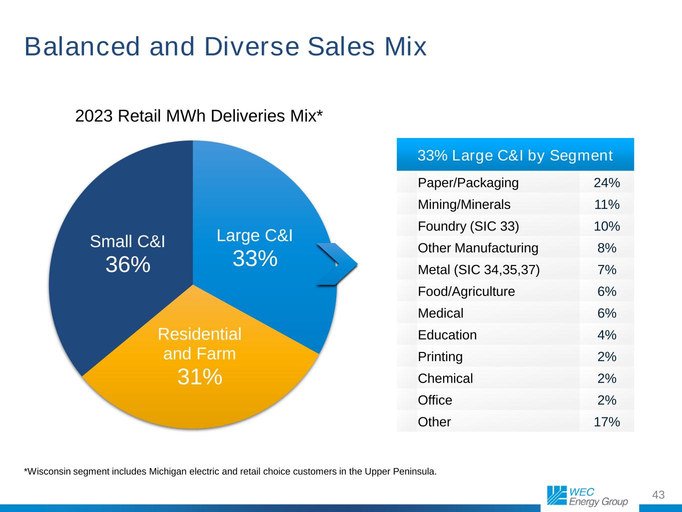 4333%按分部划分的大型C & I造纸/包装24%采矿/Minerals 11%铸造(SIC 33)10%其他制造业8%金属(SIC 34,35,37)7%食品/农业6%医疗6%教育4%印刷2%化工2%办公2%其他17%平衡多样的销售混合大型C & I 33%住宅和农场31%小型C & I 36% 2023零售兆瓦时交付混合**威斯康星部分包括上半岛的密歇根电动和零售选择客户。