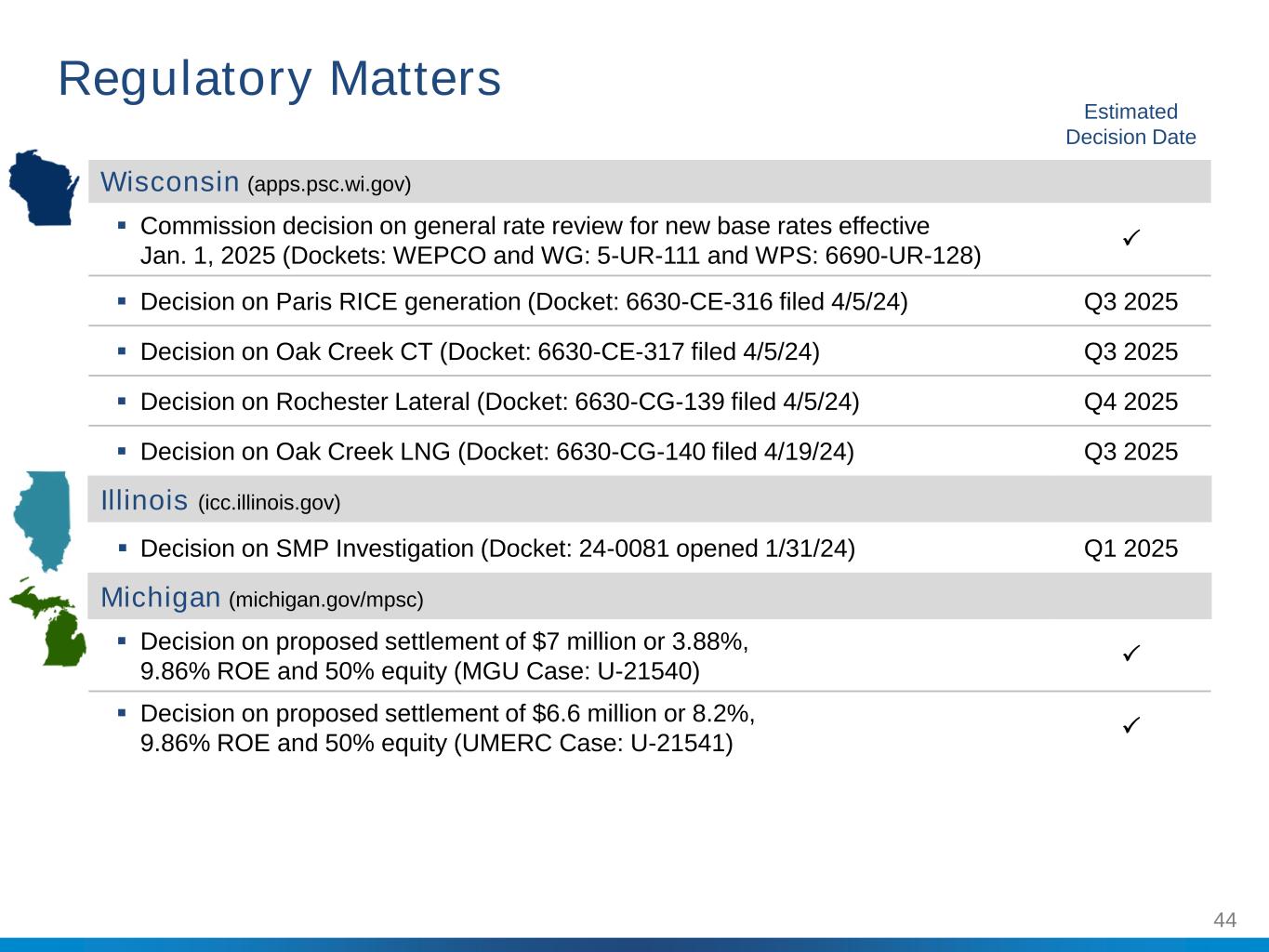 44预计决定日期威斯康星州(apps.psc.wi.gov)委员会关于1月1日生效的新基准费率一般费率审查的决定,2025(Dockets:WEPCO和WG:5-UR-111和WPS:6690-UR-128)Decision on Paris RICE Generation(Docket:6630-CE-316 filed 4/5/24)Q3 2025 Decision on Oak Creek CT(Docket:6630-CE-317 filed 4/5/24)Q3 2025 Decision on Rochester Lateral(Docket:6630-CG-139 filed 4/5/24)Q4 2025 Decision on Oak Creek LNG(Docket:6630-CG-140 filed 4/19/24)Q3 2025 Illinois(ICC.illinois.gov)Decision on SMP Investigation(Docket:24-0081 opened 1/31/24)Q1 2025 Michigan(michig9.86% ROE和50%股权(MGU案:U-21540)关于建议660万美元或8.2%和解的决定,9.86% ROE和50%股权(UMERC案:U-21541)监管事项