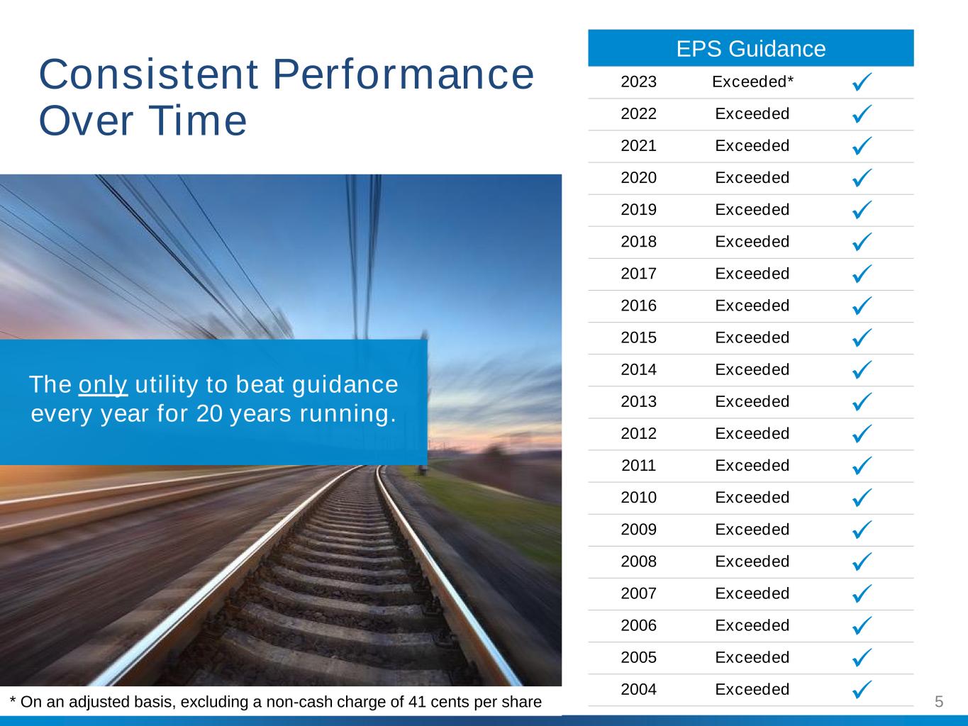 2023年EPS指引超5个*2022年超过2021年超过2020年超过2019年超过2018年超过2017年超过2016年超过2015年超过2014年超过2013年超过2012年超过2011年超过2010年超过2009年超过2008年超过2007年超过2006年超过2005年超过2004年超过连续20年每年超过指导的唯一效用。随着时间的推移表现一致*经调整后,不包括每股41美分的非现金费用